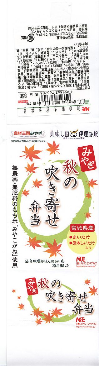 宮城県仙台地方振興事務所の支援により、2011(平成23)年10月1日から11月30日まで販売。紅葉が描かれた樽形断面の容器を、商品名やいくつかのロゴマークを描いた紙帯で留める。中身は餅米「みやこがね」混じりの茶飯の上を、大和町のマイタケ、泉区の原木シイタケ、紅鮭漬焼、サツマイモ甘露煮、シメジ、サンマ竜田揚、セリ、ニンジン、ダイコンで覆い、糸こんにゃくと仙台味噌かりんを添えるもの。
