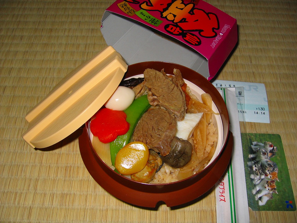 仙台駅の日本レストランエンタプライズの釜飯駅弁。商品名を書いたボール紙で封をした、オールプラスティック製の釜型容器の中に茶飯を詰めて、牛タン・煮カキ・笹蒲鉾・仙台麩などを載せる。米国産牛肉禁輸で以前のようにはいかない牛タンはともかく、仙台駅弁にしては全体的に風味が落ちるし価格も高いし、仙台名物をあれもこれもと欲張り過ぎた感はある。2005年頃までの販売か。