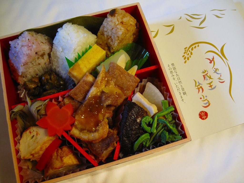 中身は御飯としてクリ混じり白飯ときのこ入り茶飯と古代米入り赤飯で3種のミニミニおにぎり、おかずはマイタケや細竹やサツマイモや山菜の天ぷら、豚の塩炒め、サトイモやカボチャなどの煮物、イワナの塩焼き、漬物とクリ大福など。煮物や焼き物や揚げ物を折り重ねる、彩り豊かな秋の味。販売期間の翌年もこうして駅弁大会に出てきており、現地でも2008年10月から12月までの3か月間で9,295個が売れたという。価格は2008年の発売時や2009年の購入時で1,100円、2016年時点で1,150円。2020年までの販売か。