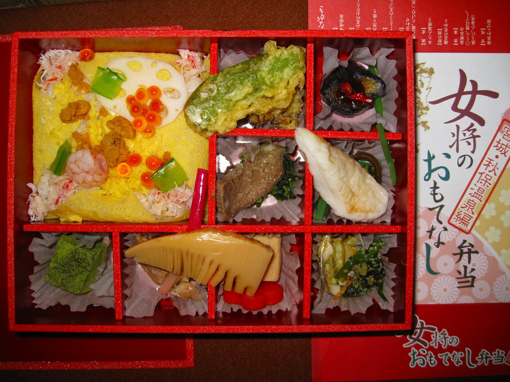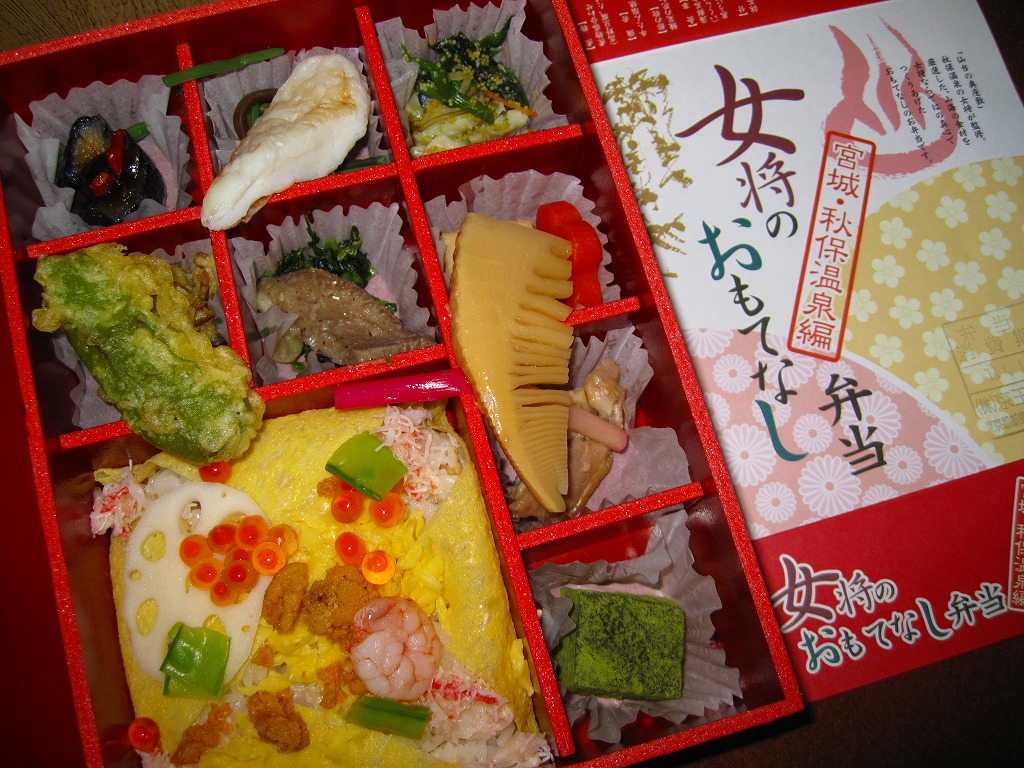 2007(平成19)年12月から仙台駅で展開される「女将のおもてなし弁当」シリーズの第1弾として、同年12月から4か月間の期間限定駅弁として発売。黒塗りの容器に、表面に駅弁の名前、裏面に仙台と秋保の名所5箇所の紹介を印刷した掛紙を巻き、ゴムで留める。9区画に分けられた中身は、御飯として酢飯を玉子焼で包んでイクラ、カニ、ウニ、小エビを載せた海鮮茶巾、おかずとしてナス味噌田楽、笹かまぼこと山菜、鶏照焼、マイタケ天とししとう天、タケノコやニンジンなどの煮物、牛たん塩焼き、ニシンと菜の花、デザートとして抹茶わらび餅。