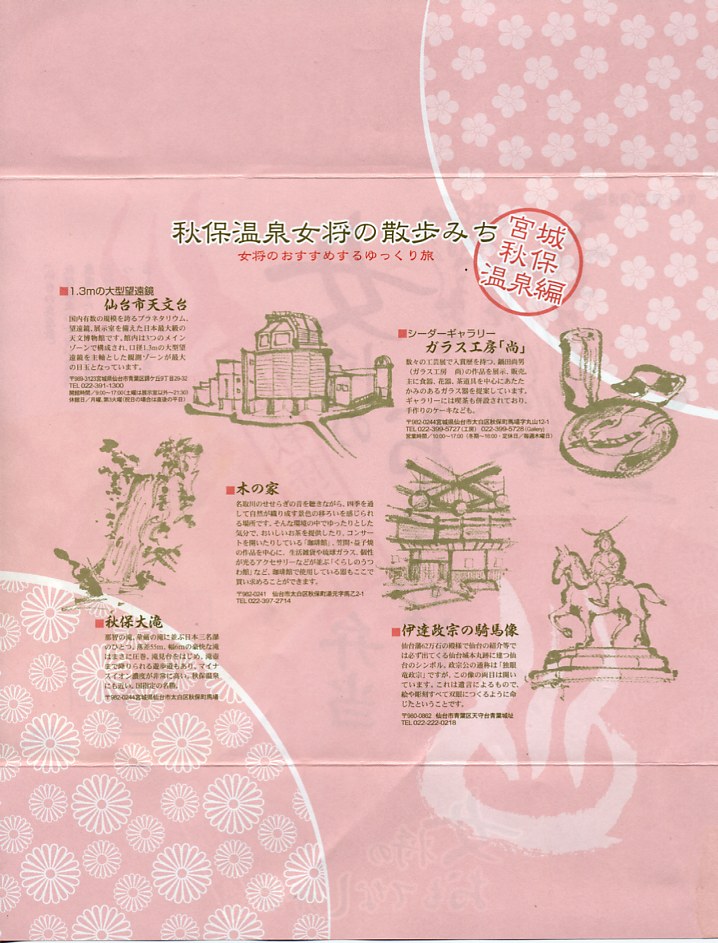 秋保(あきう)温泉は仙台市内にある、平安時代やそれ以前から記録に残る古くからの温泉地。この湯治場は大正時代の鉄道の開通により石材の採掘や温泉地として発展し、第二次大戦後は自動車の普及で仙台の市街から車で20〜30分で行ける利便性を武器に、会議場や宴会場や宿泊地として繁栄した。