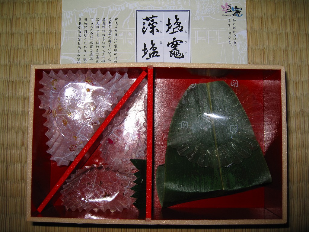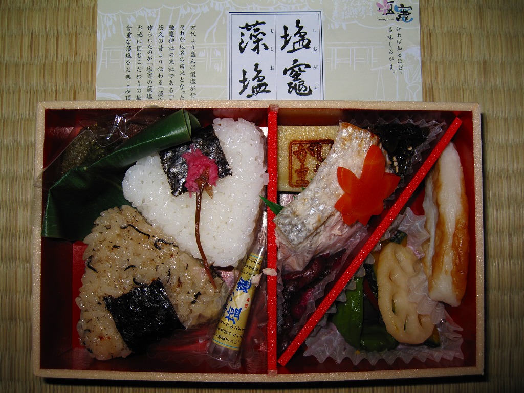 海藻を使い濃縮した塩水を釜で煮詰めて作った塩を「藻塩(もしお)」といい、この駅弁には塩竃市内でホンダワラを使い製造した藻塩が使われるとともに、袋詰めでも添付される。塩の味など直接なめない限り変わらないと思うし、1985年から2002年にかけて行われた塩の製造や販売に関する規制緩和を受けて全国に乱立したブランド塩の派手な売り文句には公正取引委員会の警告が出たほどだが、塩竃市では地域おこしの一環として藻塩が活用されている。なお、本文中でシオガマの表記が揺れ動いているのは誤記ではなく、それぞれで使い分けられている。