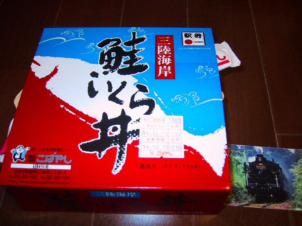 この駅弁、下の「三陸海岸鮭いくら丼」と調製元や価格や容器が同じで、中身も鮭の個数が少ないくらいしか差がない。リニューアル品か駅弁大会専用商品なのだろうか。