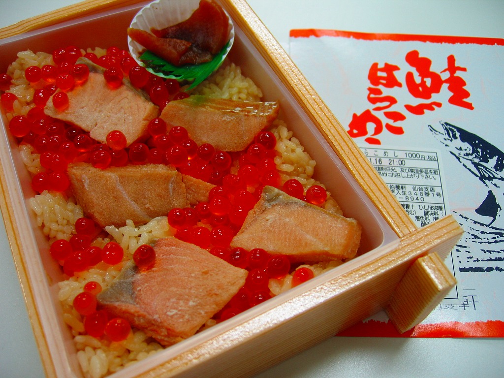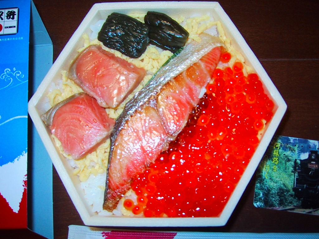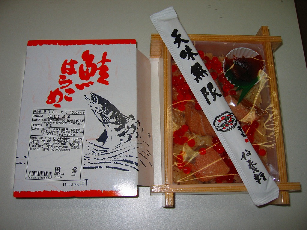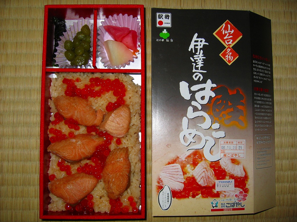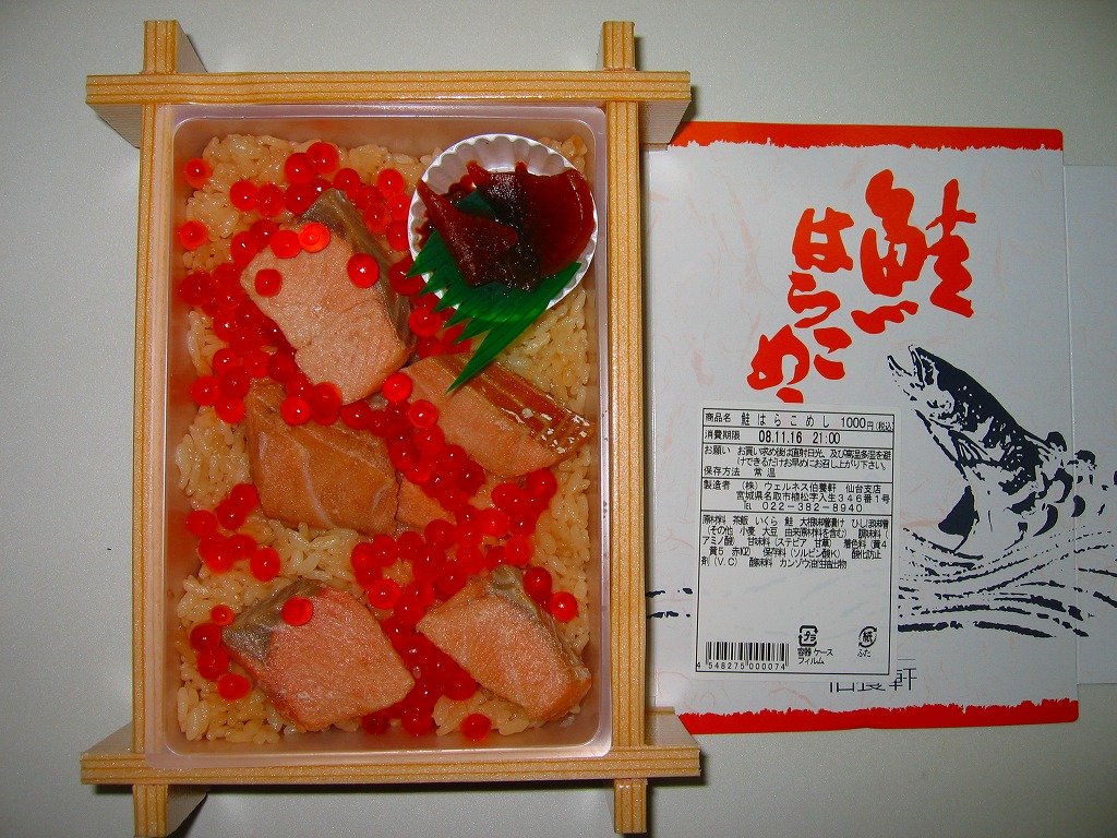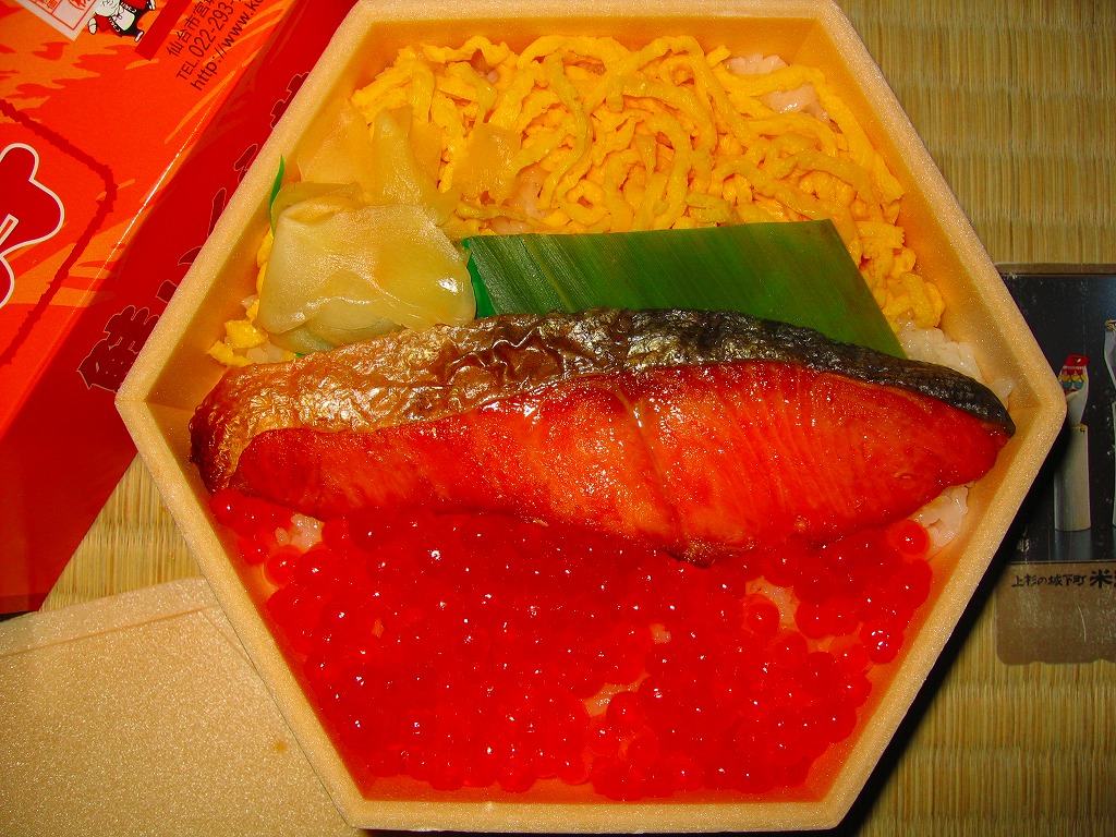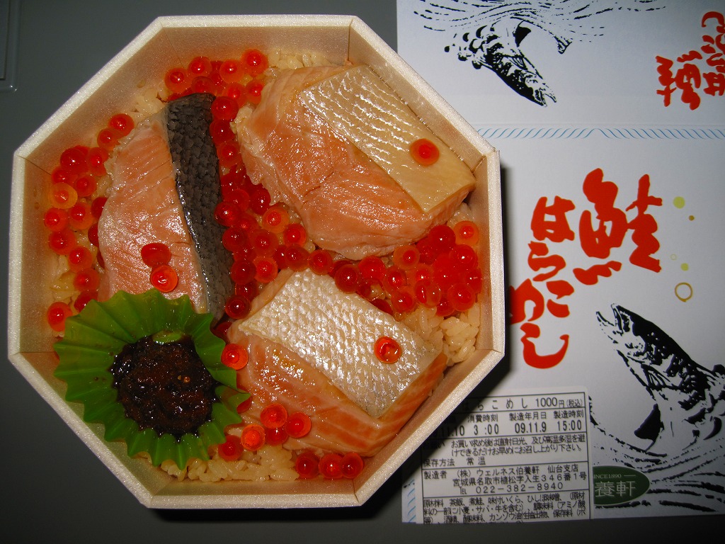 正六角形の容器をボール紙のパッケージに収める。中身は白御飯の上にイクラを敷いて、残りの部分に錦糸卵を敷いてから鮭をペタペタと載せたもの。見た目も味も駅弁の名前どおりで、品質はさすがの仙台駅弁。中身も価格もライバル業者の「鮭はらこめし」への対抗駅弁か。2005年頃までの販売か。
