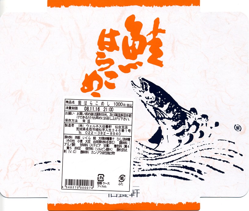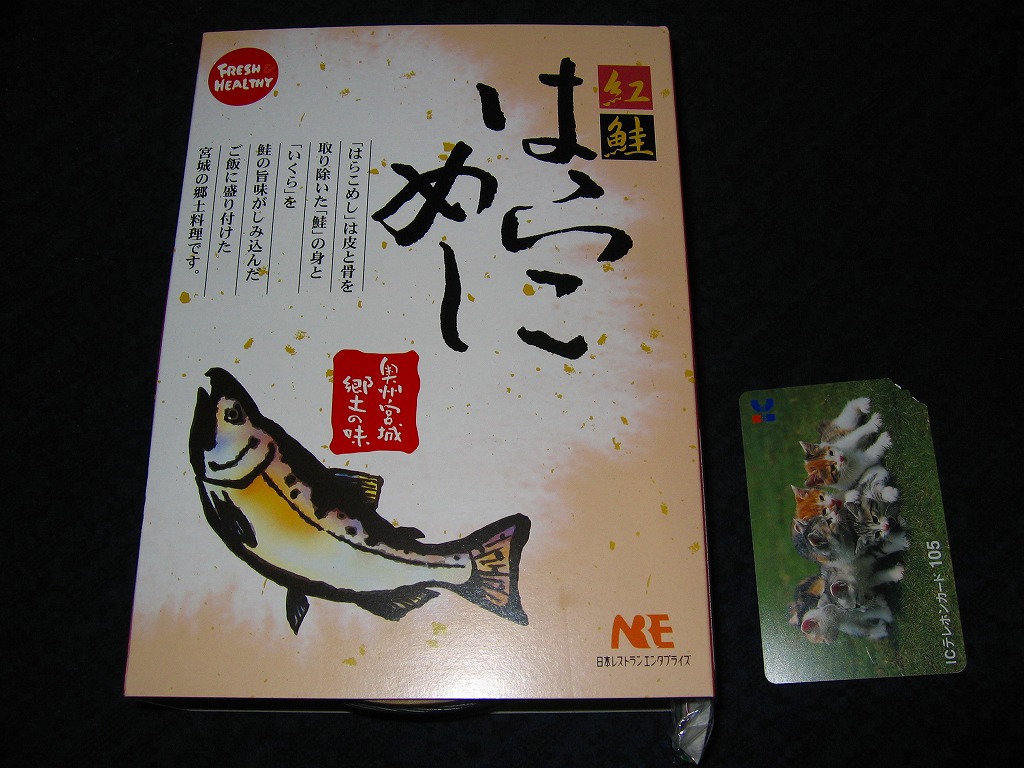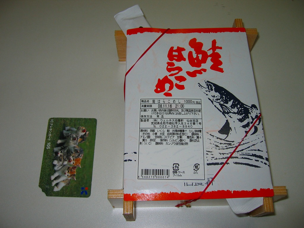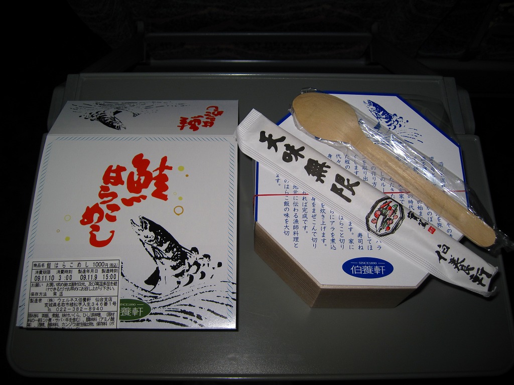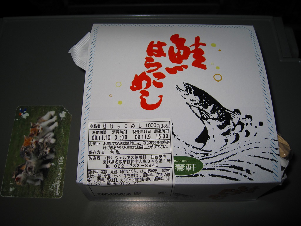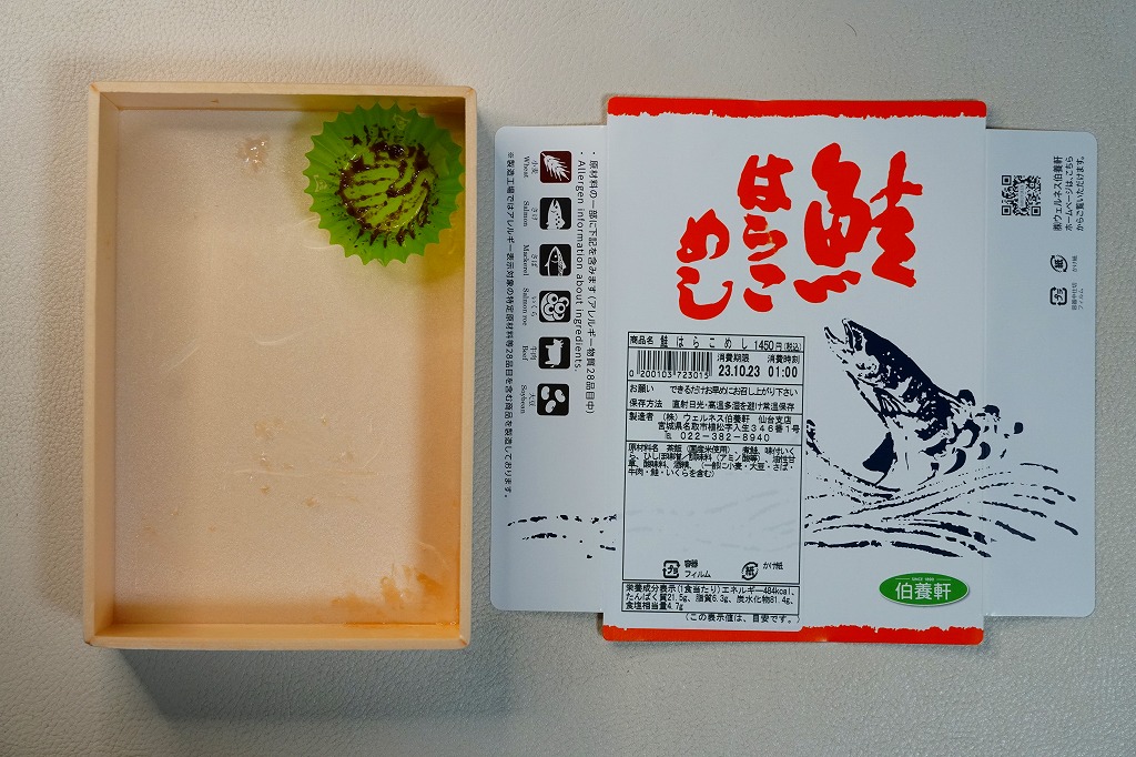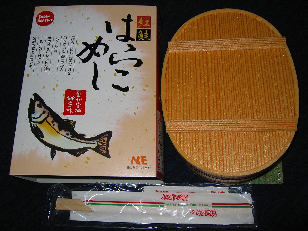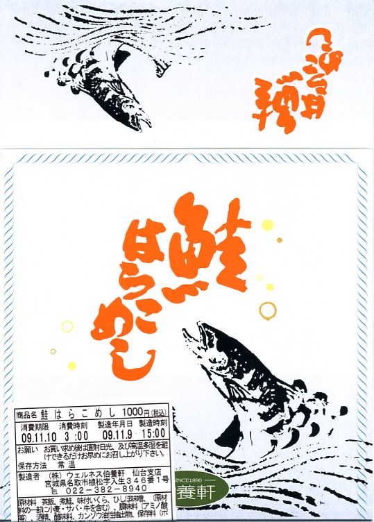 2005(平成17)年8月に発売か。長方形の黒い容器に同色同素材のふたをして輪ゴムで留め、中身イメージ写真を載せた紙枠にはめる。中身は仙台駅弁名物の鮭はらこめし。味噌しそ巻、うぐいす豆、ゆず大根、紅大根が付け合わせ。
