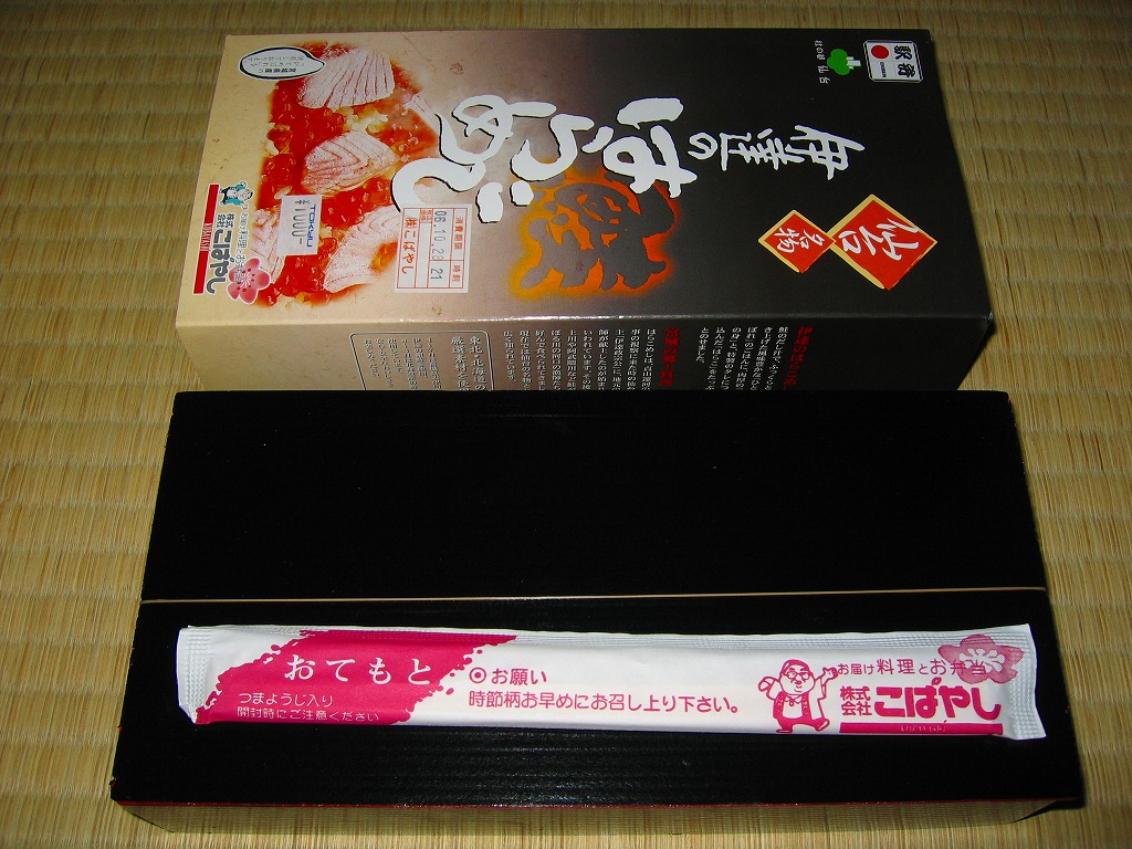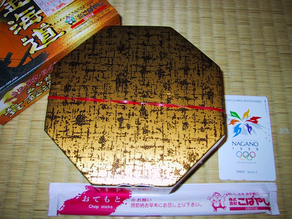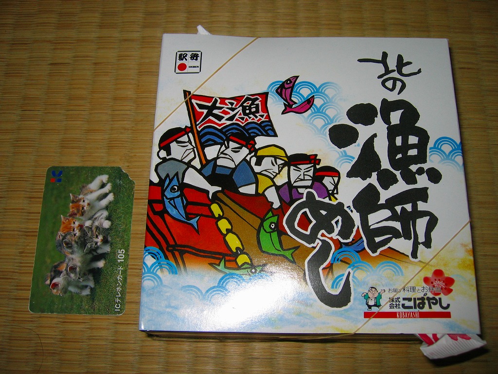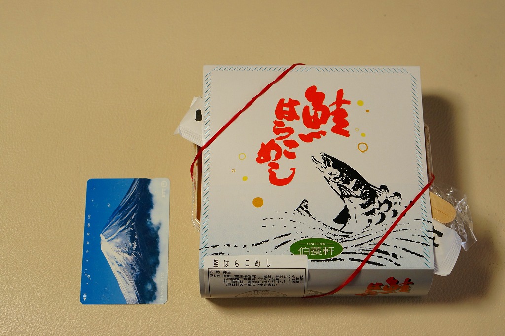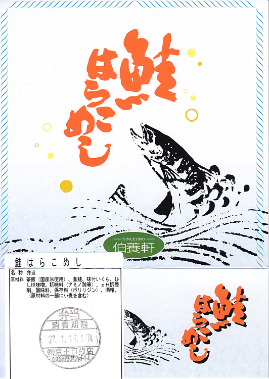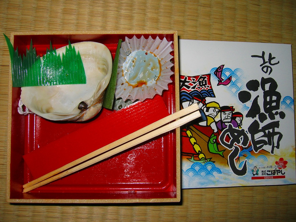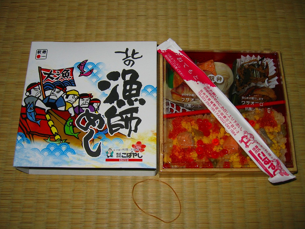 2008(平成20)年の秋に発売か。正方形の小さな容器に透明なふたをして、小舟の漁師を切り絵風に描いたボール紙の枠にはめる。中身はシャケ、イクラ、とびっこ、玉子そぼろ、山くらげを散らす茶飯に、貝殻に収めた鮭味噌焼とホッキ貝に、ホタテとひじき煮を添えるもの。