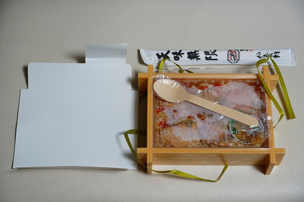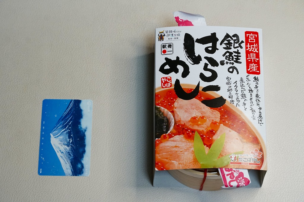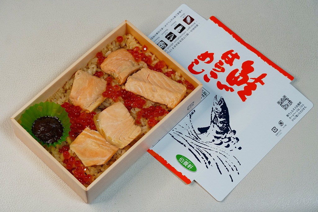 JR東日本の駅弁キャンペーン「駅弁味の陣2019」へのエントリーに向け、2019(令和元)年10月1日に仙台駅と東京駅で発売。駅弁では初めて出現したと思う、高級はらこめし。長円形の容器に、宮城県産米だて正夢を使う鮭飯を詰め、宮城県産銀鮭を使う焼サケを散らし、イクラと漬物を添える。見た目では具が少なそうで、しかし味はとろけるおいしさ。2020年までの販売か。