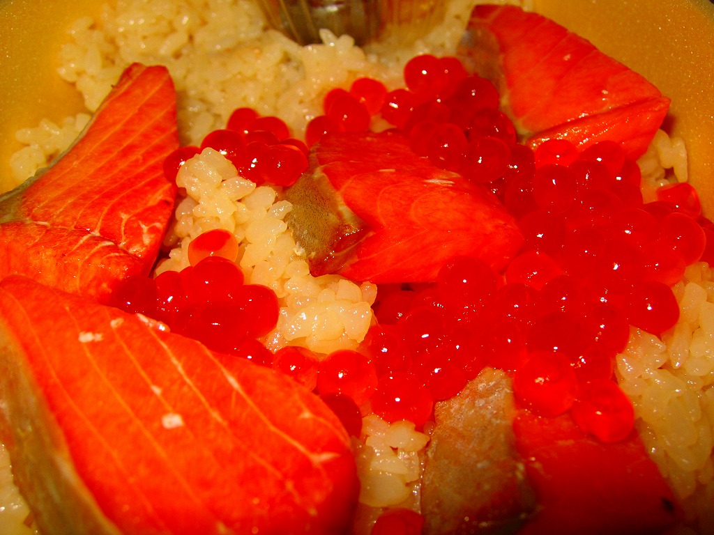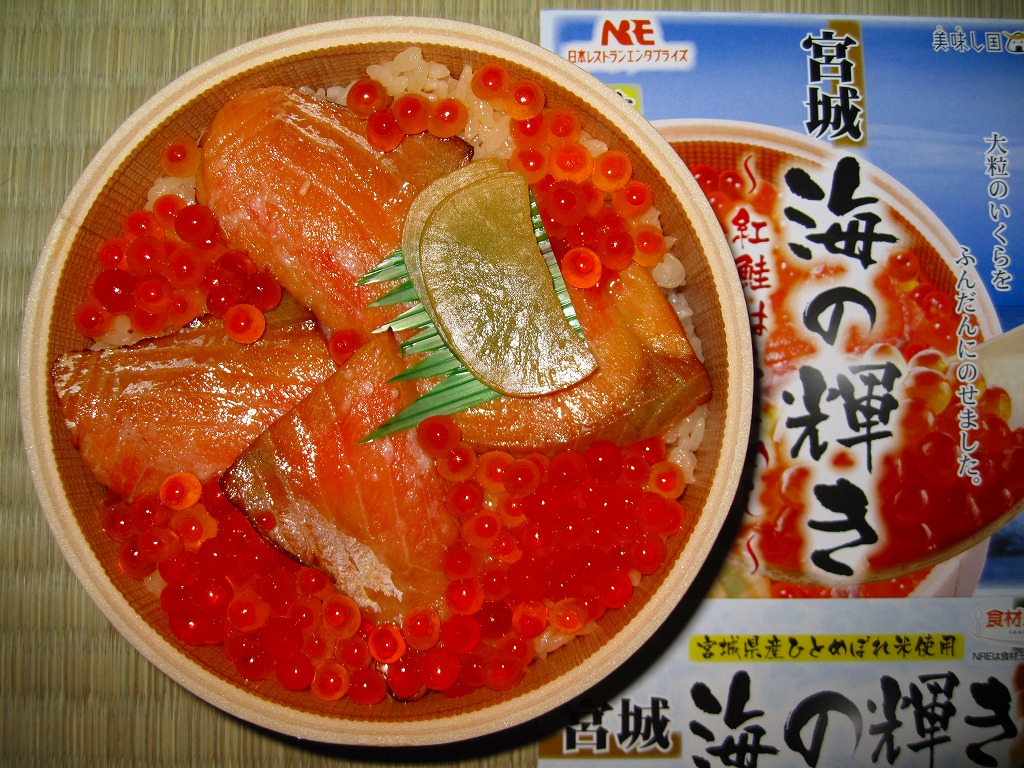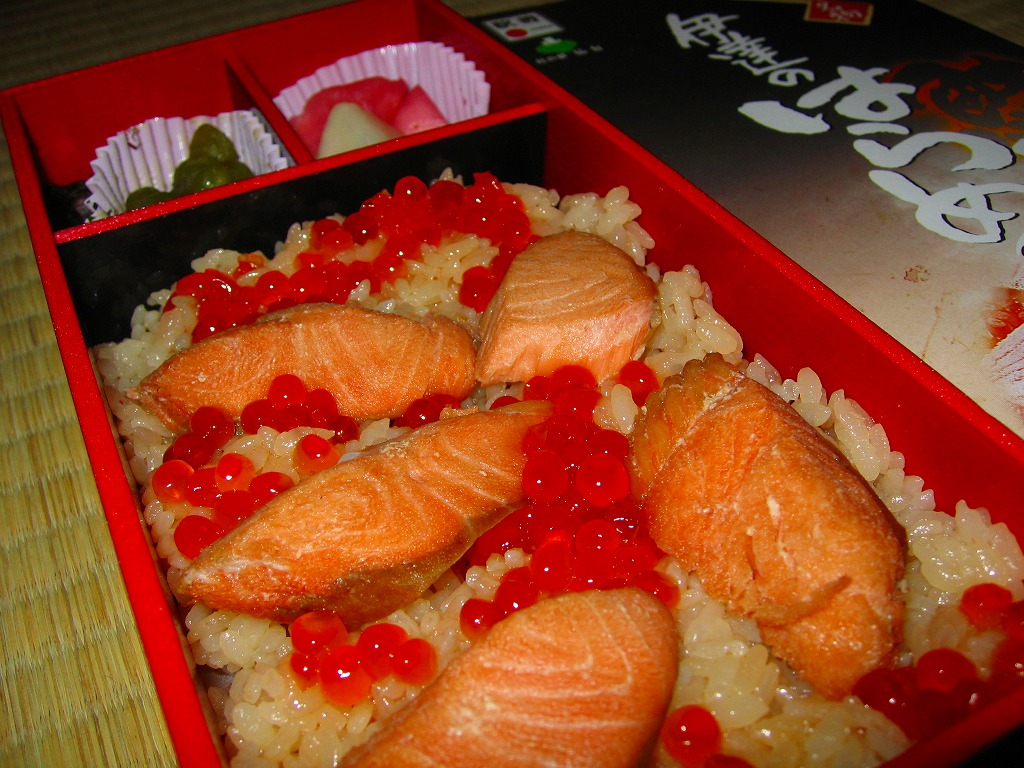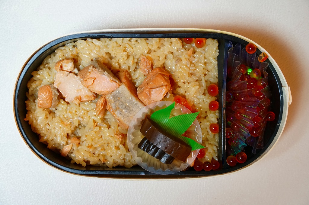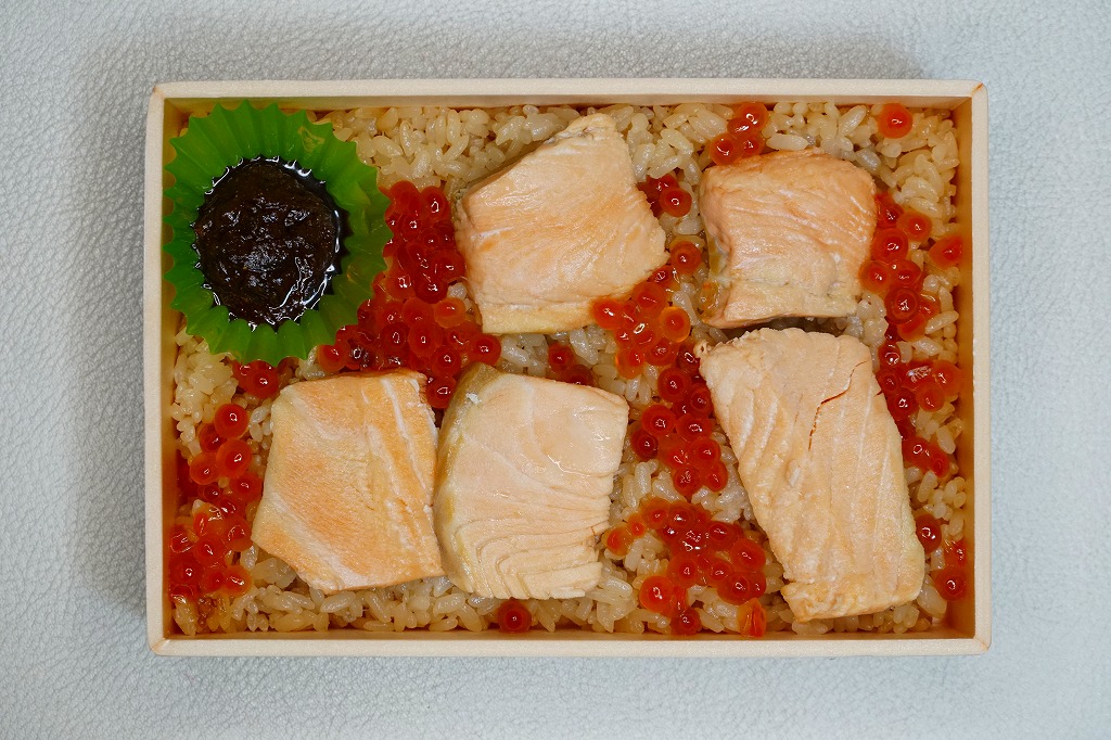 茶飯とイクラは普通の風味も、鮭が妙にポソポソしており、そこだけ例えば東京駅冷凍輸入駅弁「O−bento」当初版の味。現地でもそうならば、仙台駅弁3社中3番手の評価になりそう。加熱機能付き容器版もあるそうだが、イクラを暖めるのはよくない。2009年頃までの販売か。