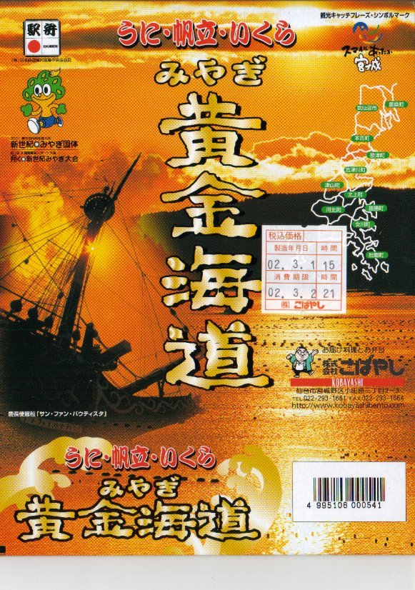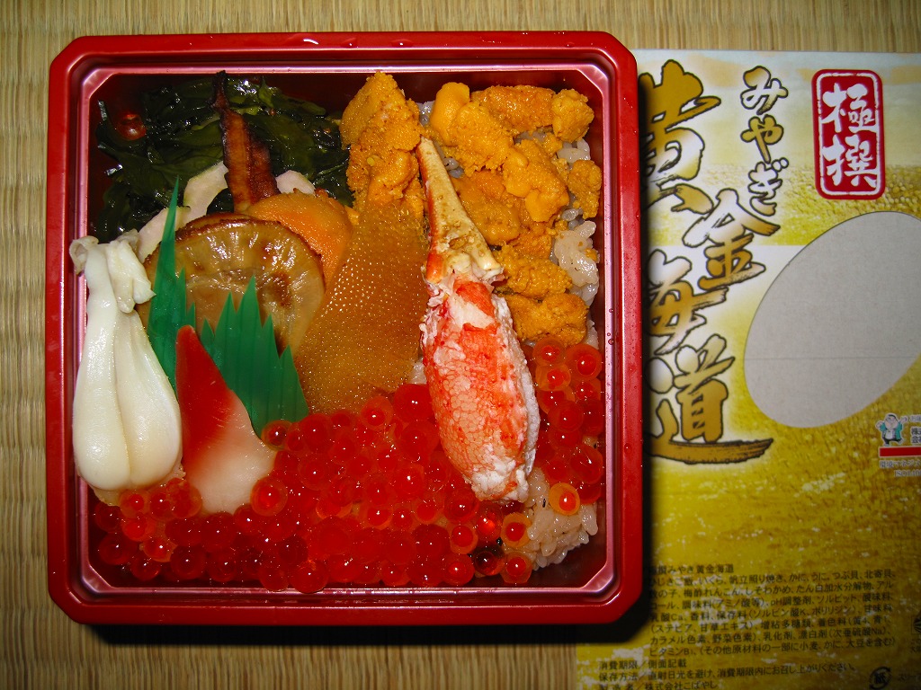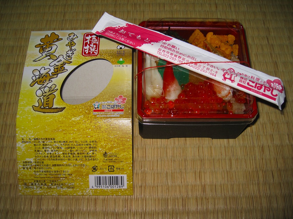 2000(平成12)年8月に仙台駅で発売。八角形で柔らかめの容器を、ボール紙製パッケージに押し込む。中身は御飯の上にうに・帆立・いくらのパッケージ記載食材とともに、やりいか姿煮・山くらげ・錦糸卵・焼鮭と、なぜかたっぷりの紅生姜を載せる、パッケージも容器も中身も見た目に豪華で華やかな駅弁。仙台の駅弁なので味もしっかりしている。パッケージの底には黄金海道の由来を記載。価格は2002年の購入時で1,000円、2014年2月から1,050円、2017年時点で名前が「新みやぎ三陸黄金海道」になり、2022年に終売か。