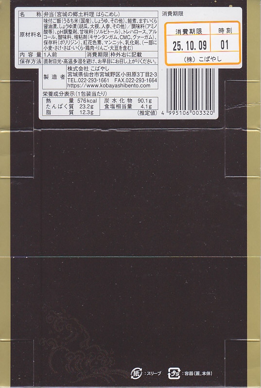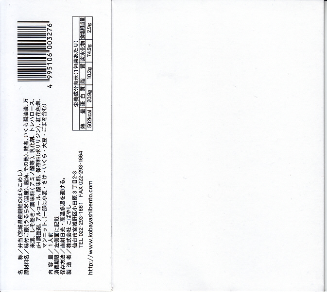 2009(平成21)年11月9日に購入した、仙台駅弁のパッケージ。味や中身は上記の2015年のものと変わらないが、当時は中身にふたがあり、そこに鮭はらこめしの解説文が掲載されていた。なお、底面の「新古川」駅は古川の誤記である。