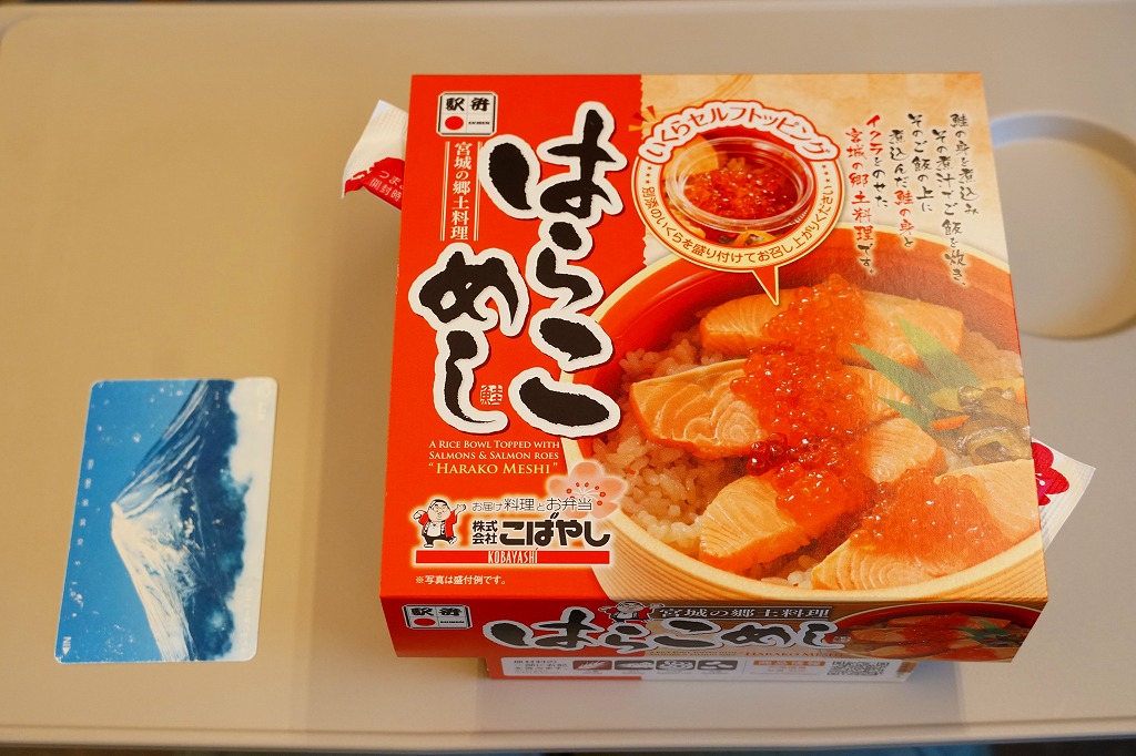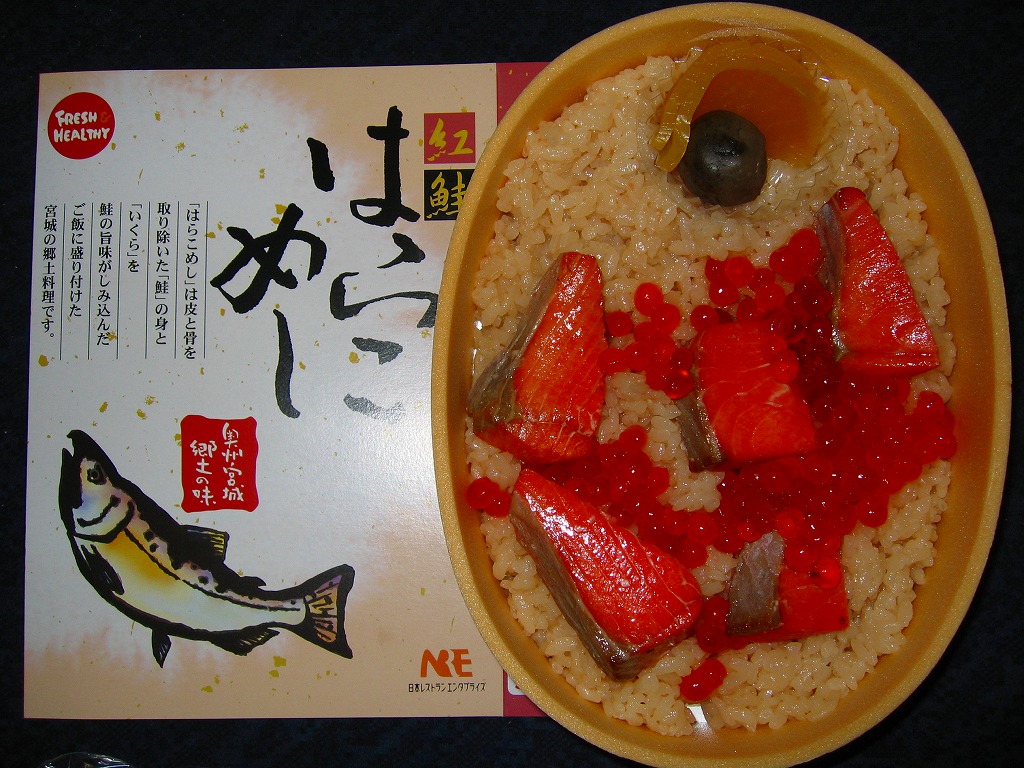 2009(平成21)年の末頃に、下記の駅弁「紅鮭はらこめし」をリニューアルか。円形の容器を、中身の写真を美しく印刷したボール紙の枠にはめる。中身は鮭風味飯なる茶飯の上を、レアに焼いた紅鮭漬け焼と輝くイクラ醤油漬で覆い、ダイコンの味噌漬けを添えるもの。東北地方っぽい塩辛さがうまい。価格は2010年の購入時で1,000円、2017年時点で1,100円、2018年時点で1,150円、2020年時点で1,200円。日本レストランエンタプライズ(NRE)改めJR東日本フーズ改めJR東日本クロスステーションは、2022年9月に仙台調理センターを廃止したため、この駅弁もそれまでに終売か。