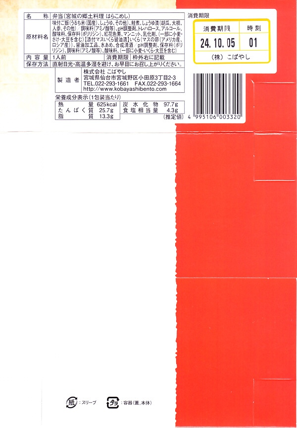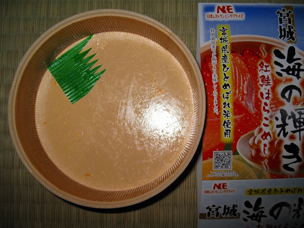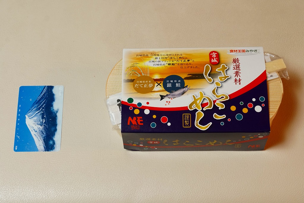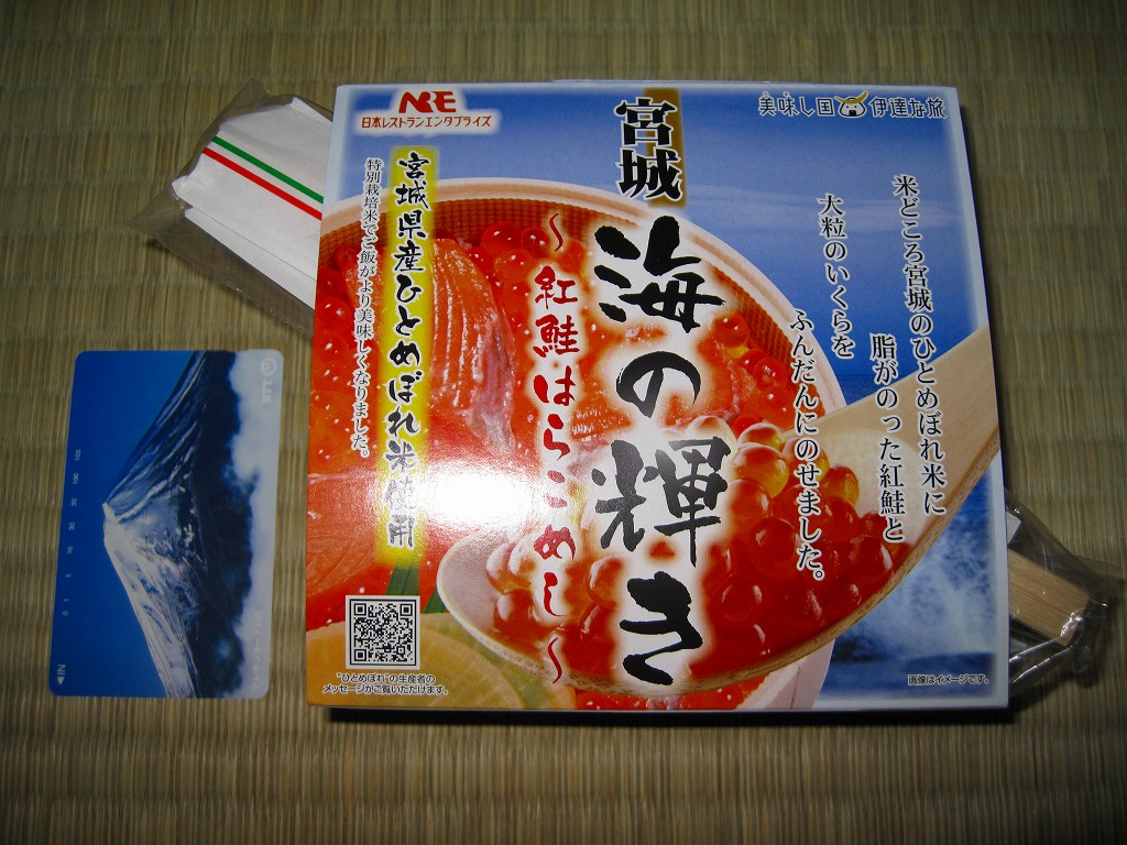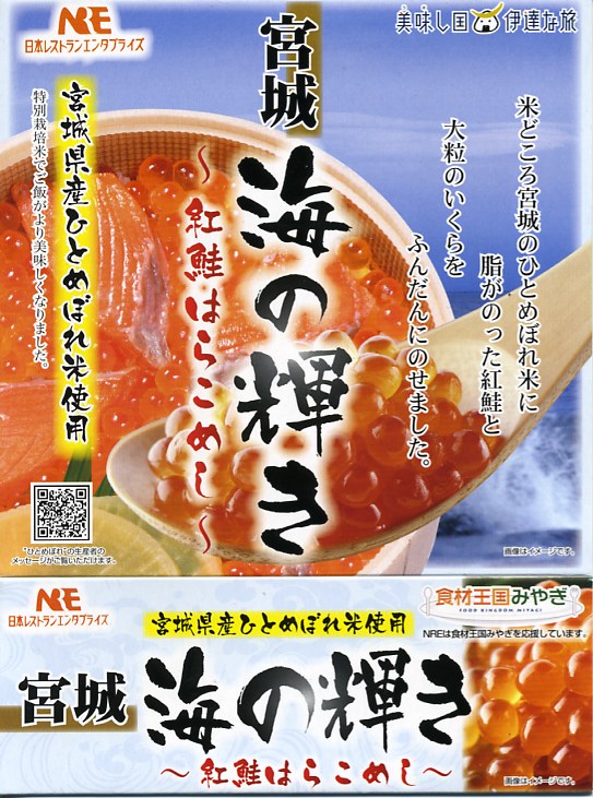 仙台駅弁伯養軒の代表商品「鮭はらこめし」のNRE版。小判型容器を、駅弁の名前や鮭や宣伝文句を描いたボール紙の枠にはめる。中身はまんまの鮭はらこめし。鮭風味の茶飯の上に鮭とイクラを少々載せる。