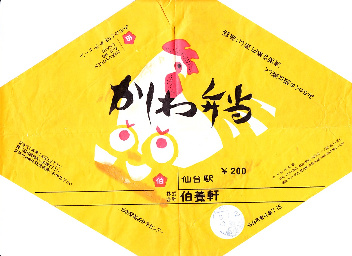 1960年代の調製と思われる、昔の仙台駅弁の掛紙。ニワトリに見える絵柄で中身を想像できると思うが、仙台で鶏を「かしわ」と呼んで、わかってもらえたのだろうか。この名前の仙台駅弁は1990年代まで存続し、今は分かりやすく「とりめし」。