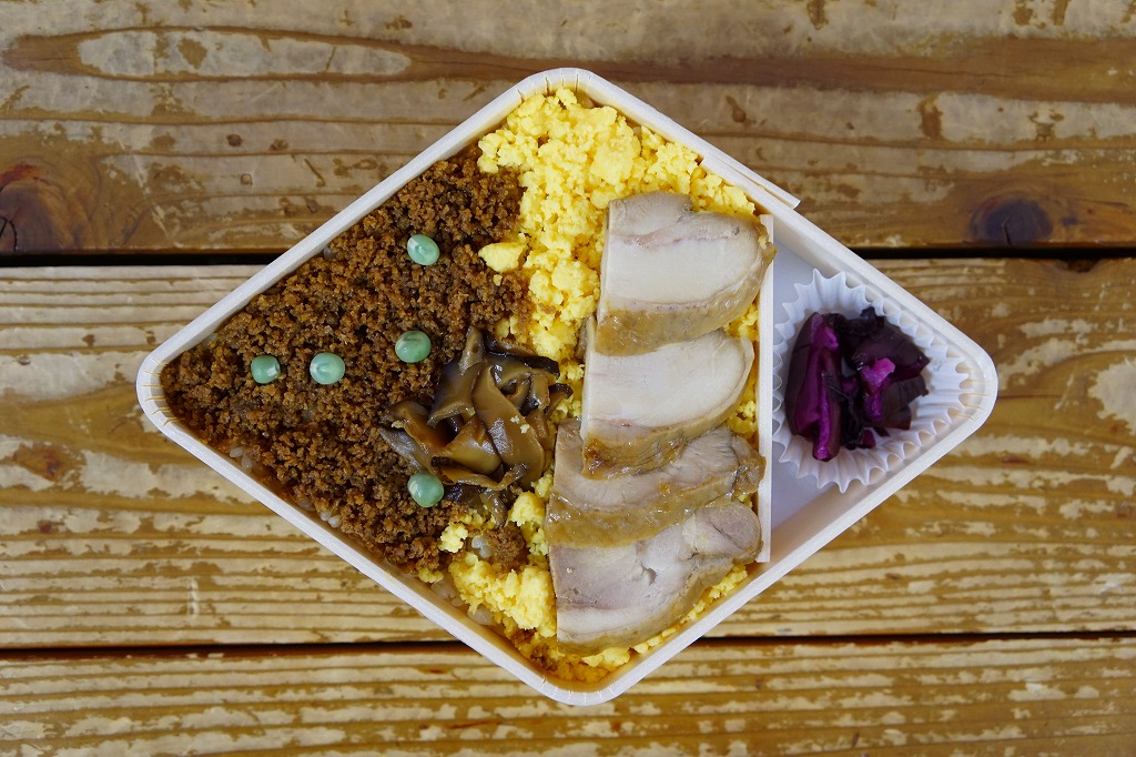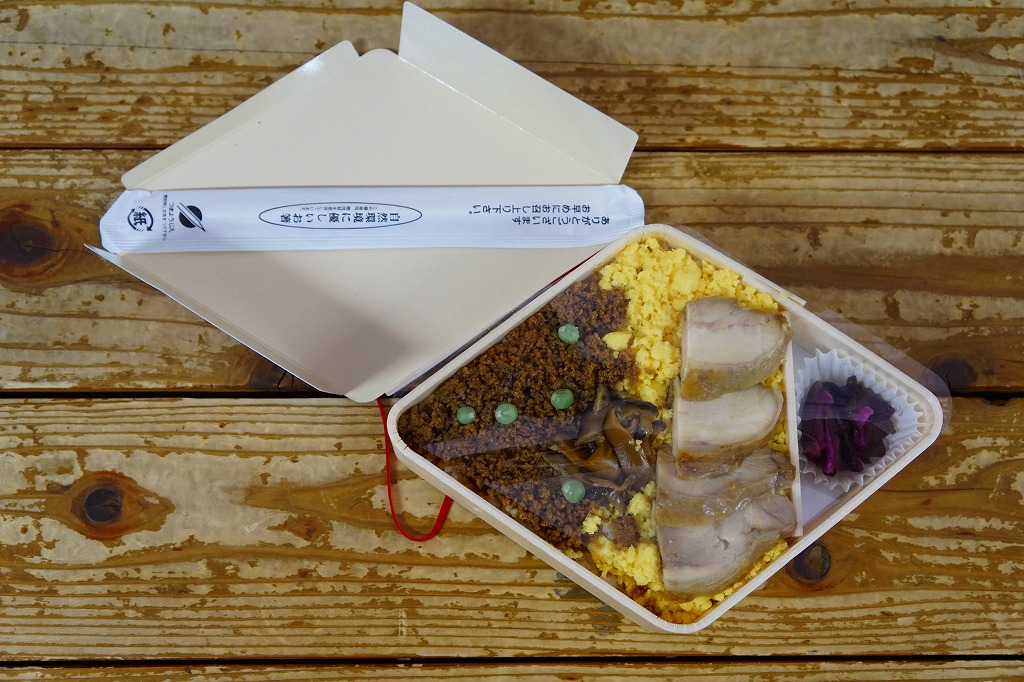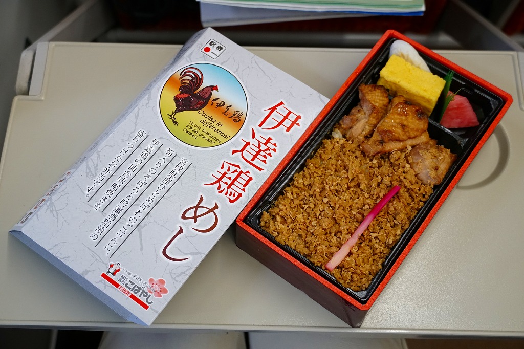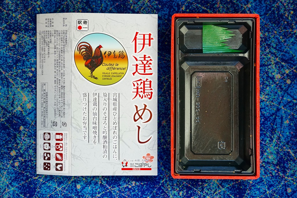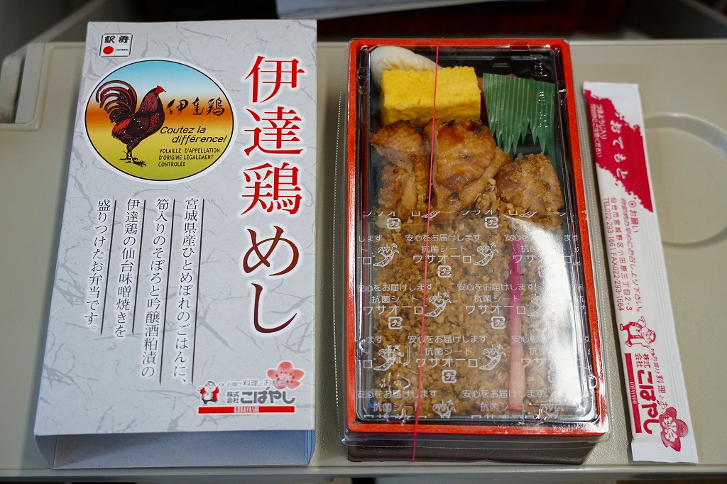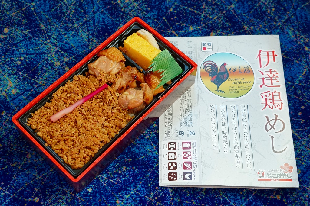 2018(平成30)年2月に仙台駅で発売か。白飯をタケノコ入りの鶏そぼろと鶏肉の酒粕味噌漬焼で覆い、はじかみで彩り、玉子焼、笹かまぼこ、紅大根を添える。御飯に宮城県産ひとめぼれを、肉に福島県の伊達物産のブランド鶏「伊達鶏」を使うという。食べれば普通の鶏飯駅弁も、その味は上質。価格は2018年の発売時や2019年の購入時で980円、2022年6月から1,080円。