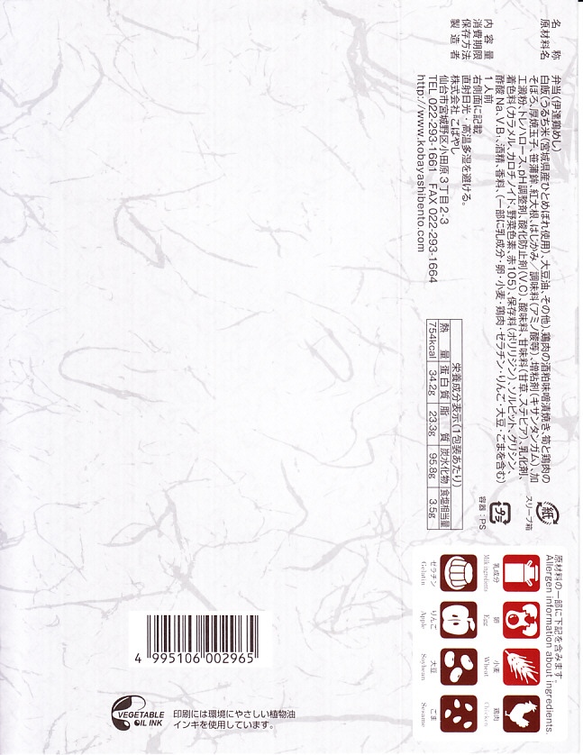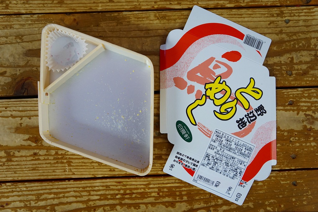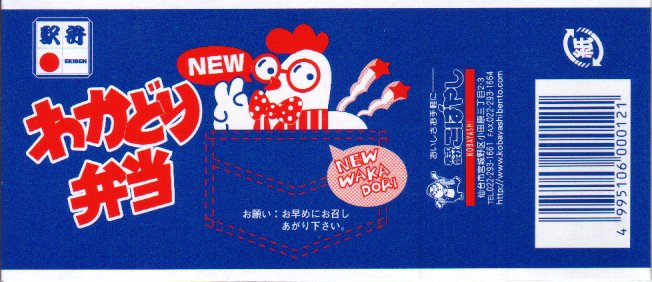 強度がなく貧弱なプラ容器を、駅弁の名前を書いて鶏がピースをするボール紙の枠をはめる。中身は白御飯の上に、鶏照焼と鶏唐揚その他を載せた、シンプルなもの。見た目に仙台を感じる点はないが、駅弁ファンなら味で仙台駅弁と分かるかもしれない、こんな傍流の商品でも高品質を保つのはさすが。過去には「わかとり弁当」を名乗っていたそうな。2014年頃までの販売か。