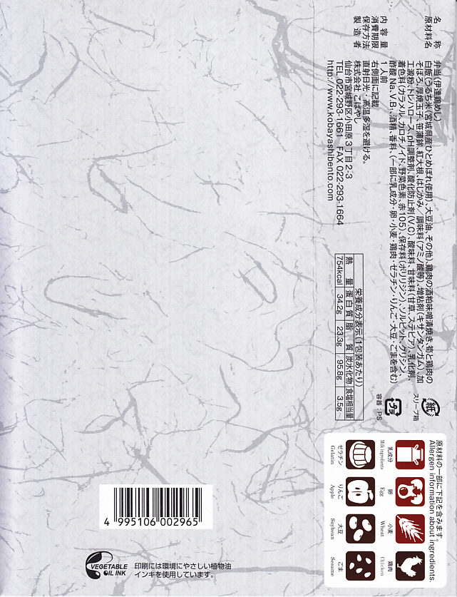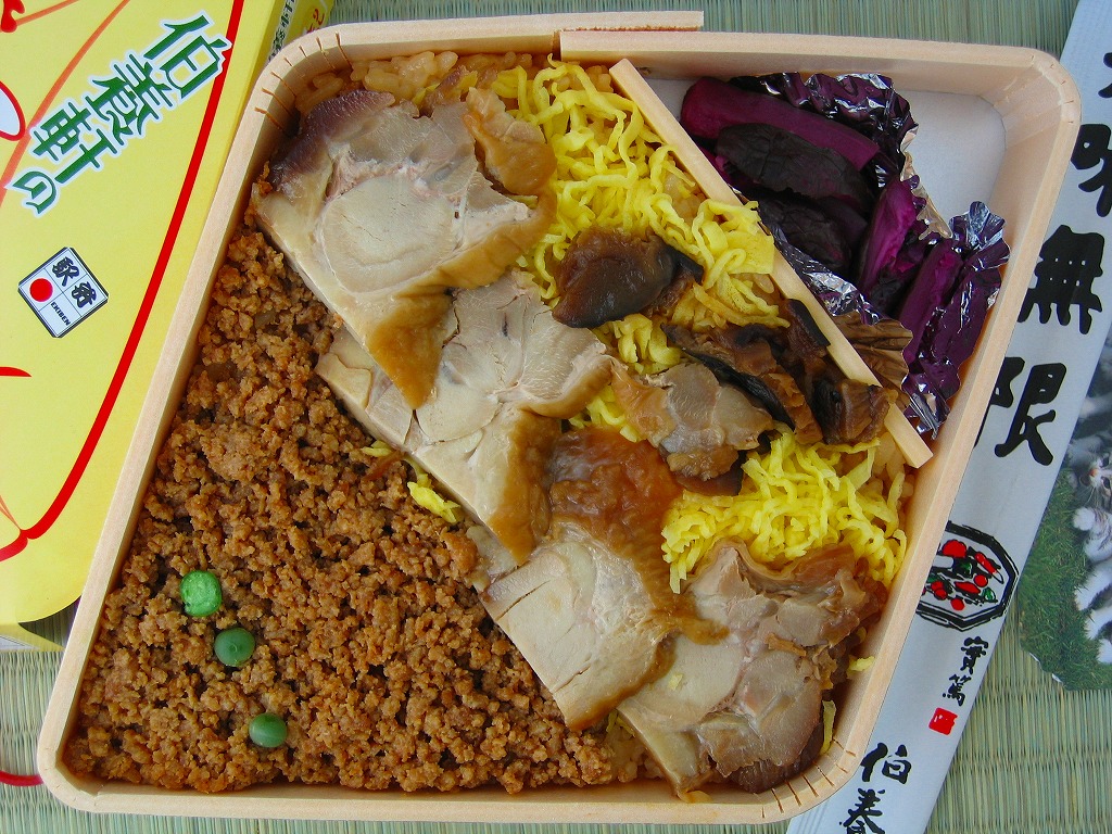 この種の駅弁は各地でいくつも見た気がするが、こちらは鶏肉の締まりの良さと、玉子そぼろの手作り感で上位レベル。仙台駅弁は鶏もうまい。付合せの見栄えと内容をもう一段上げれば、なおよい。2009年頃までの販売か。