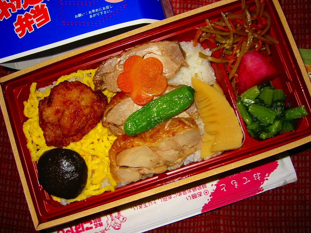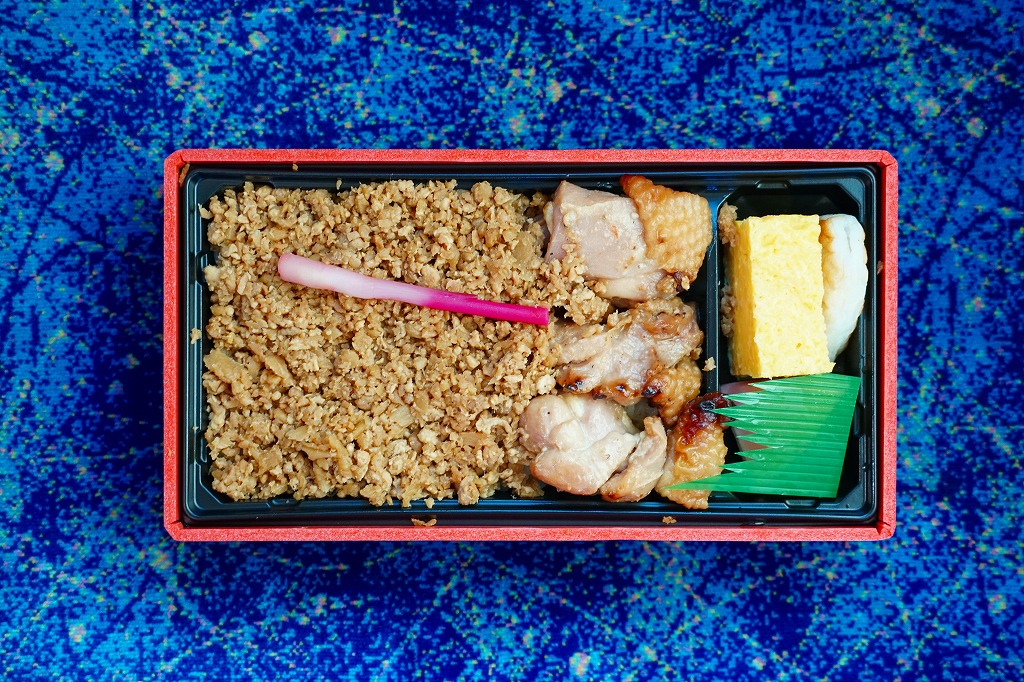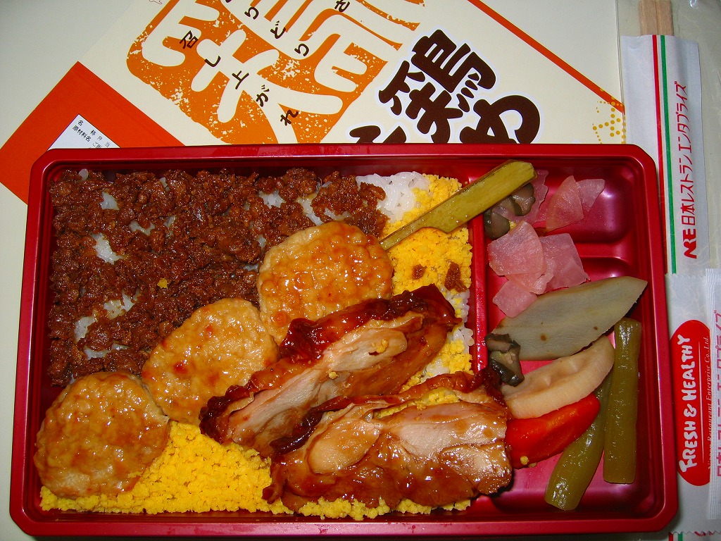 2005(平成17)年4月4日に発売。長方形の黒い容器を、鶏炭火網焼を思わせる写真を載せたボール紙の枠にはめる。中身は白御飯の上に鶏そぼろ、卵そぼろ、炭火であぶり焼きにしたという柚子風味な宮城県産「みちのく鶏」3切れ、タケノコなどを載せ、うぐいす豆、大根浅漬け、玉子焼、蒲鉾を添える。