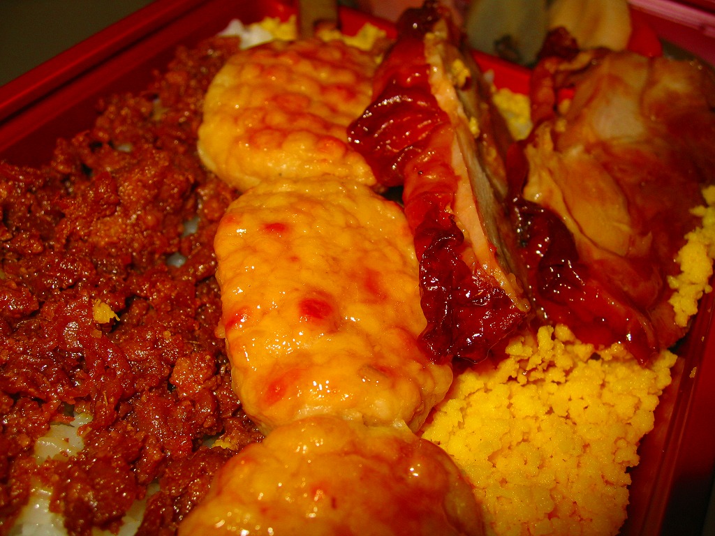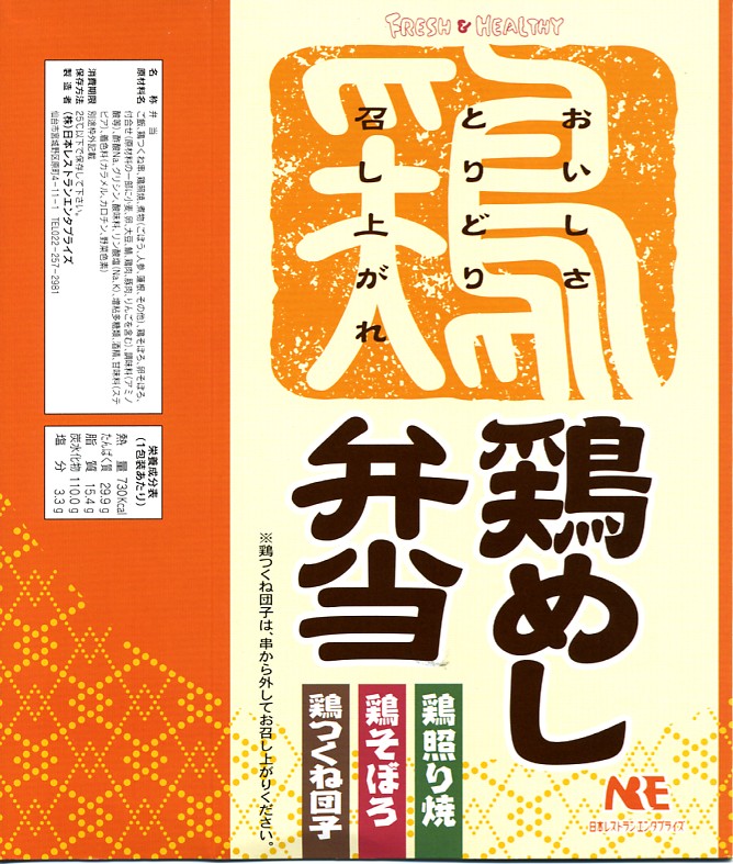 仙台駅の鶏飯駅弁の、日本レストランエンタプライズ(NRE)版。各地の駅弁でよく使われる長方形のプラ容器に、白飯を詰め、辛めの鶏そぼろ、軟らか鶏つくね団子、しっかり鶏照焼と三種の鶏で覆い、煮物などを付け合わせる。内容に仙台駅との関わりは現在も今後も薄そうだが、機能本位で風味も分量も価格も申し分なく、地元業者を駆逐しない範囲で売れて良いと思う。今はこの姿では存在しないと思われる。