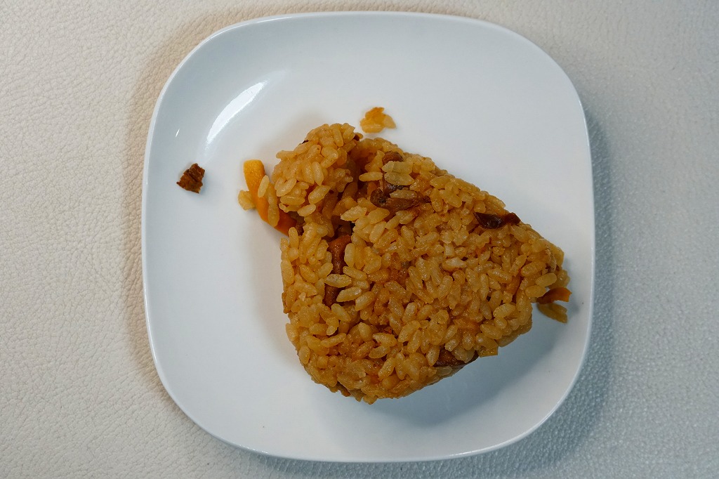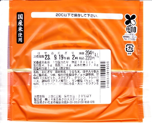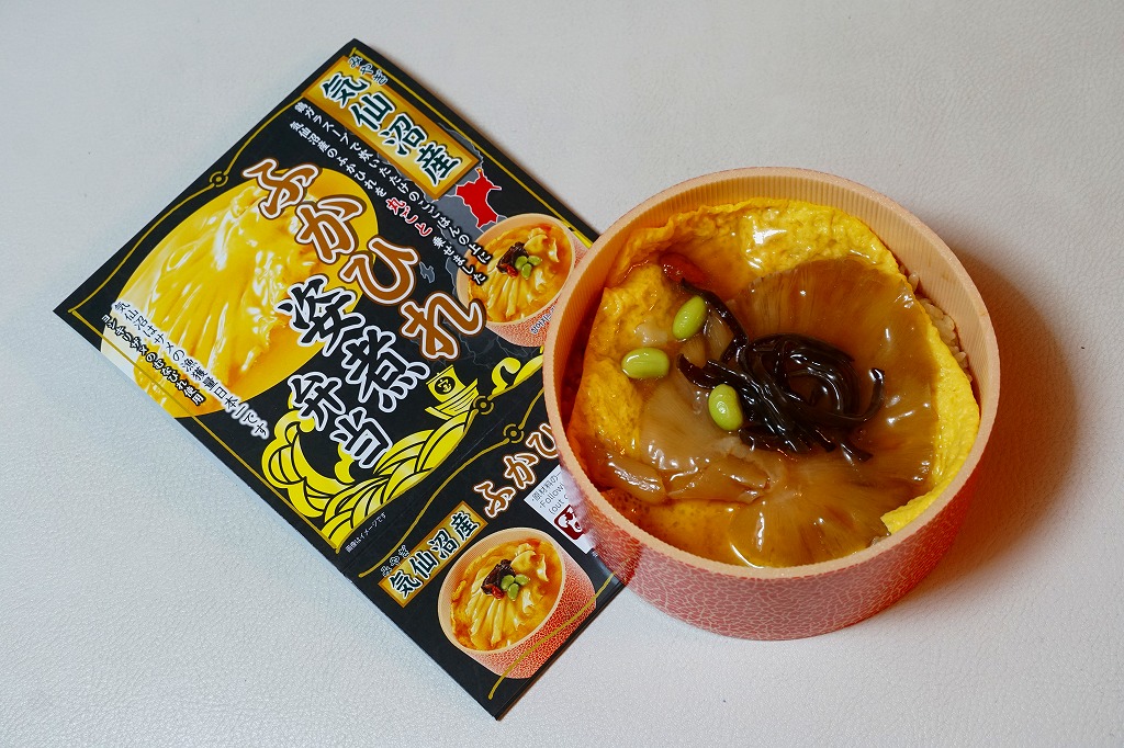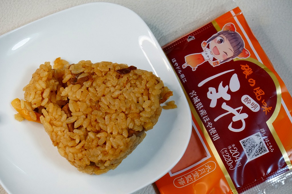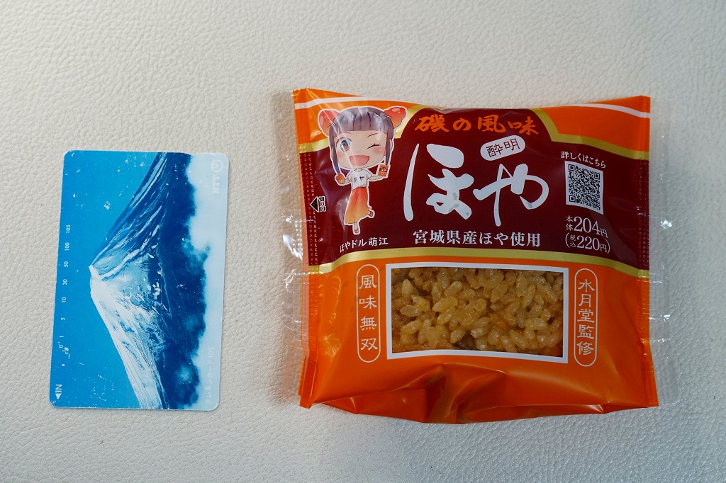 中身はホヤの炊き込み御飯のおにぎり。ホヤの産地でなく首都圏で製造された食品ではあるが、味は上記の現地での駅弁と変わらず、ホヤガイと称される貝のような臭みあるいは固さ、あるいは鮮度が落ちると出てくるという苦みや渋みないし金属臭もしくはガソリン臭のない、たとえればウニ飯を淡泊にしたようなもの。これで東京の市民にホヤをアピールできただろうか。価格は現地版が200円、この催事版が220円。