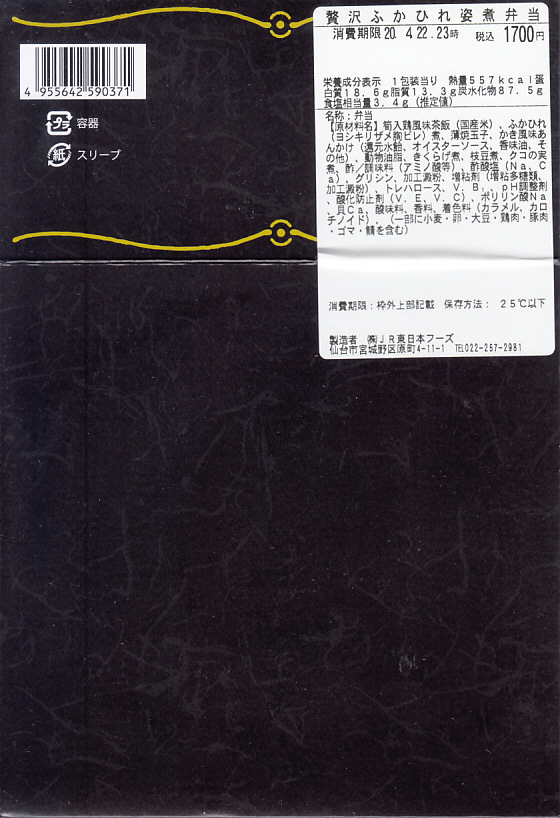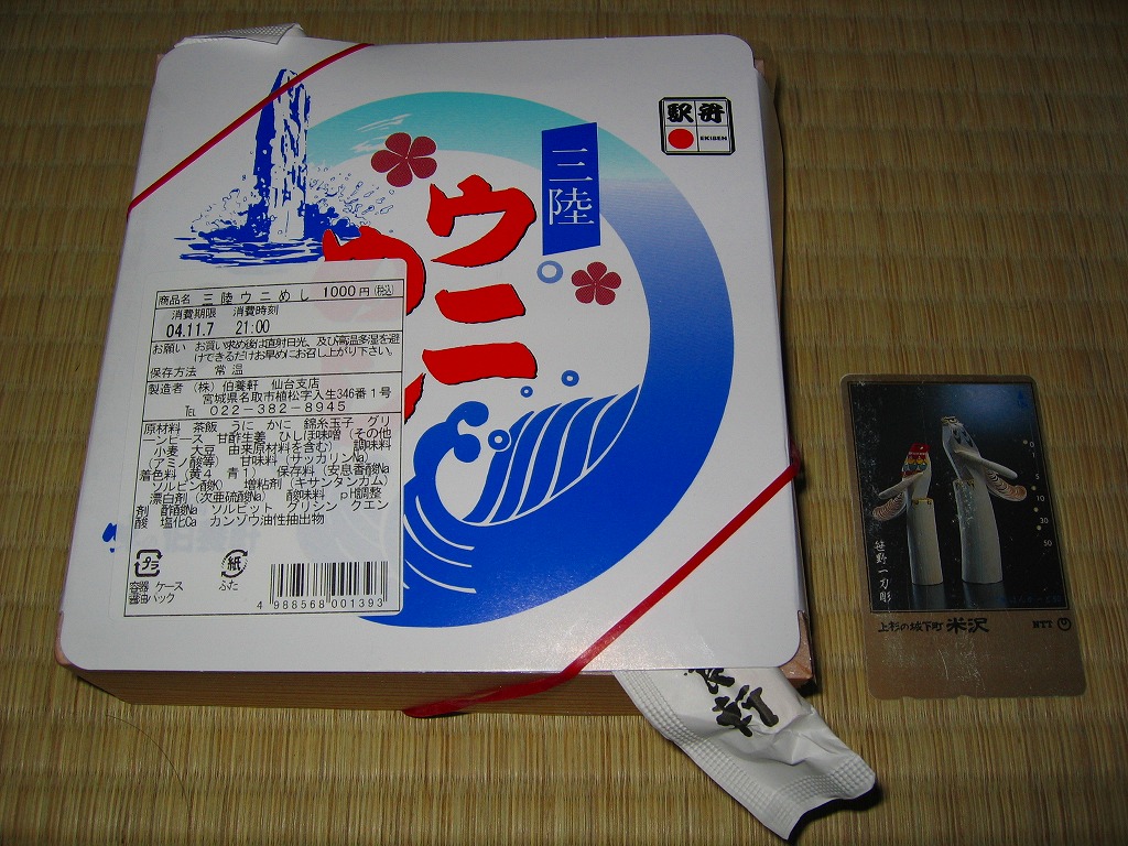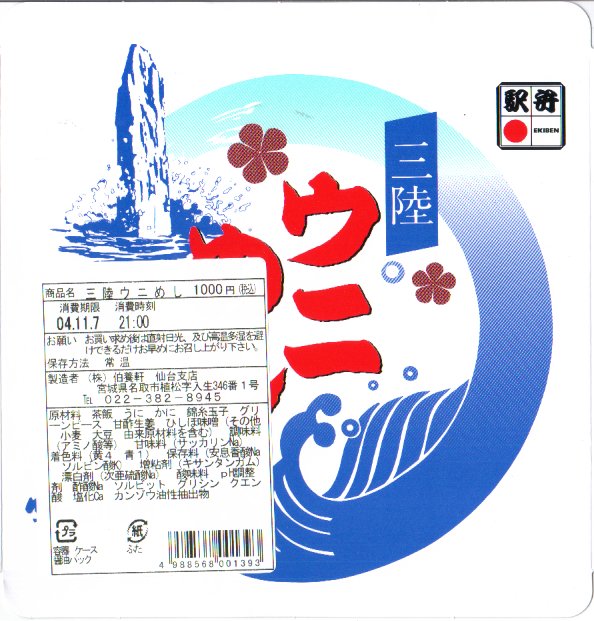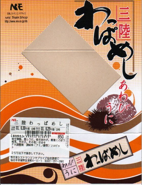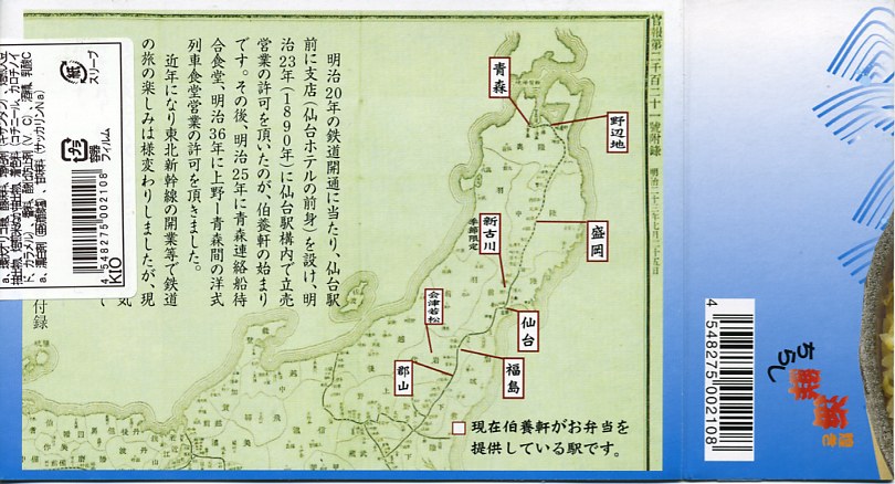 これは盛岡駅伝統の駅弁と思いきや、現物に盛岡の文字がなく製造者が伯養軒の仙台支店なので、ここでは仙台駅弁として収蔵するが、実は巨大な食品表示ラベルの下に「盛岡 味の伯養軒」の印刷が隠れている。「三陸」の地域名は、宮城県エリアの陸前と岩手県エリアの陸中と青森県エリアの陸奥を示すから、つまり仙台でも盛岡も青森でもウソにならず、この地域一帯を支配する調製元にとって便利な名称か。