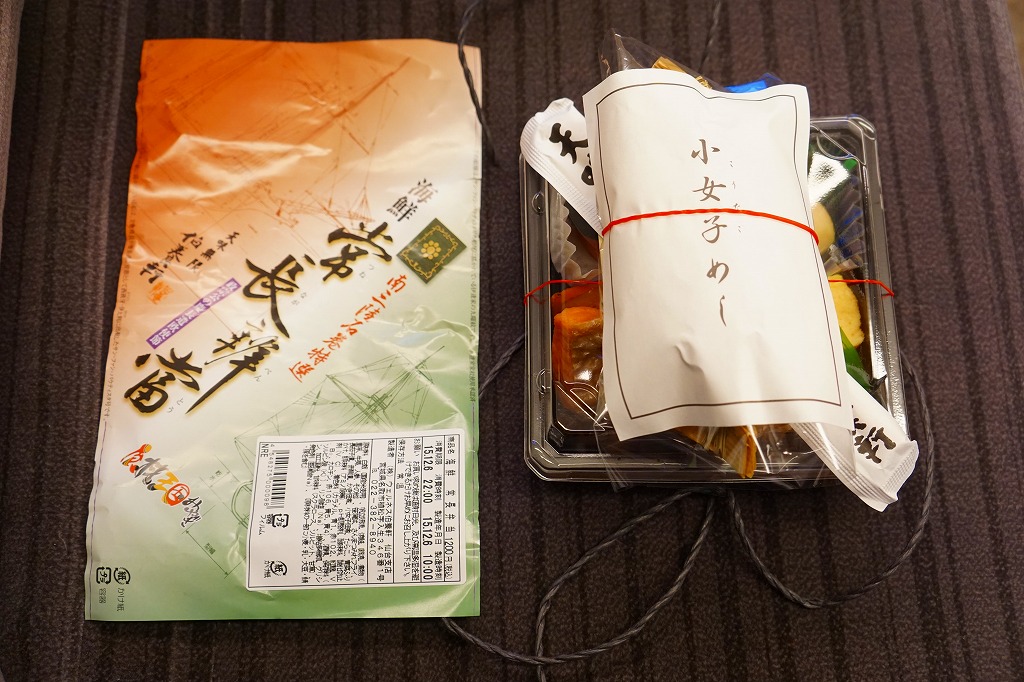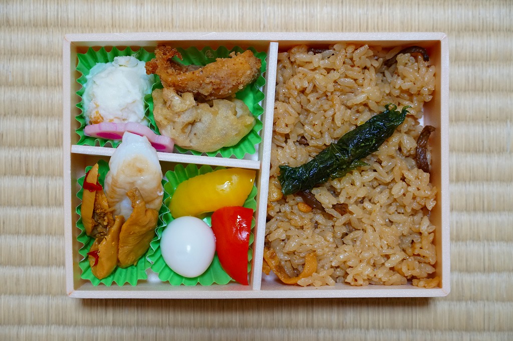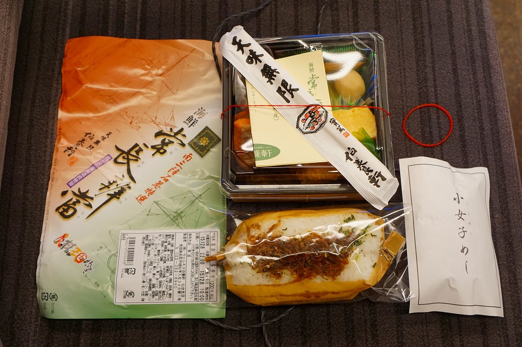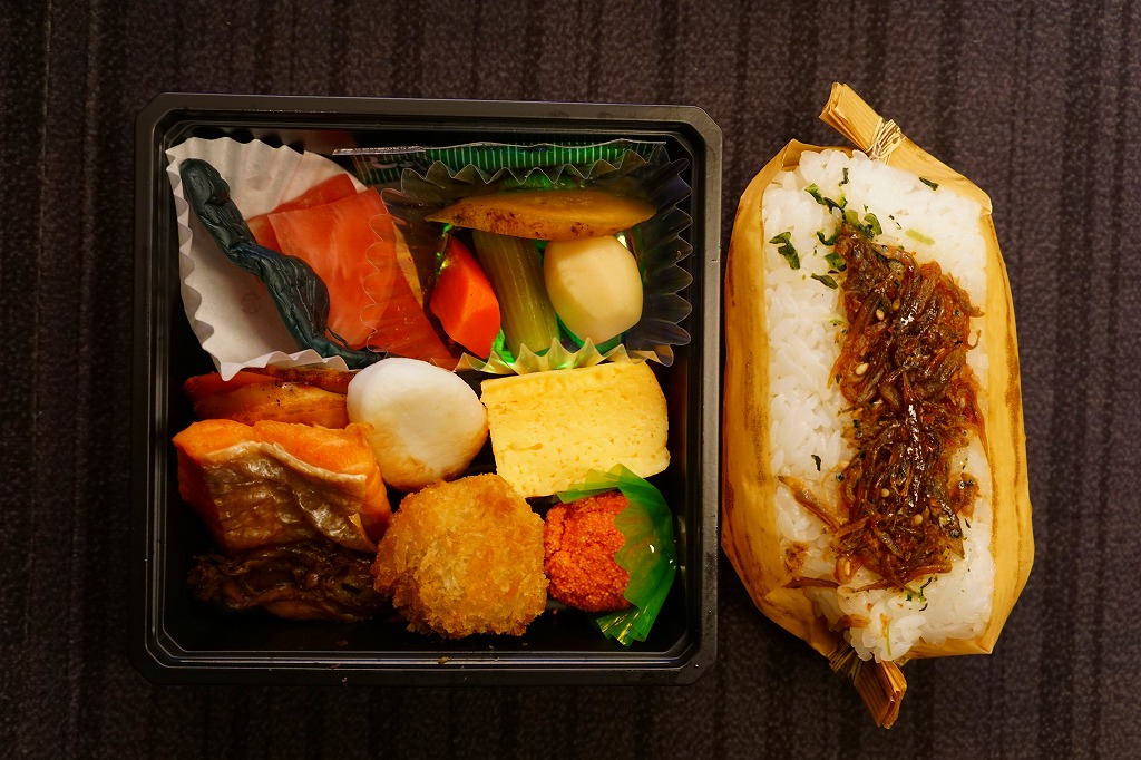 中身は、竹皮風の紙に包んだ小女子(コウナゴ)めしと、カキ佃煮、鮭塩焼、さんまつみれフライ、ホタテ照焼、焼たらこ、笹かまぼこ、厚焼き玉子、ゴボウやサトイモなどの煮物、赤かぶと長なすの漬物。食べにくくはあるが、こんな技巧は印象に残るし、食べても様々な食材が常温でおいしい、優れた駅弁に感じる。2018年までの販売か。