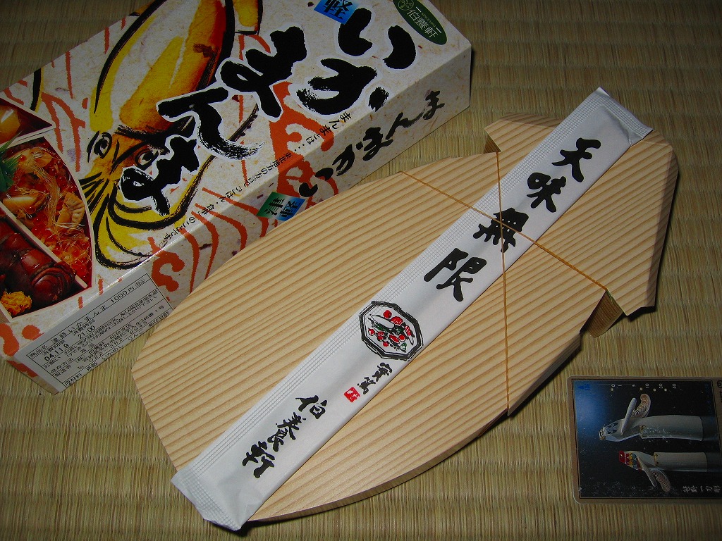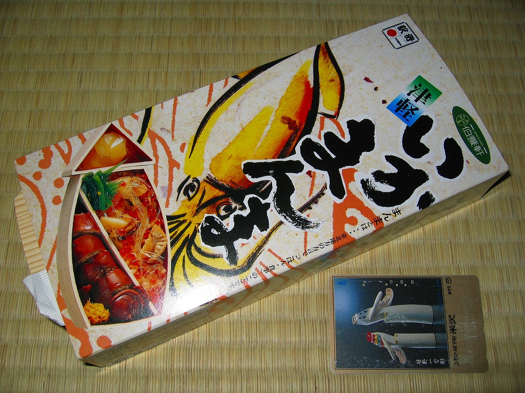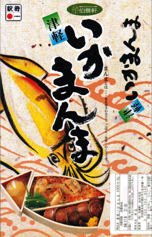 これはどこの駅弁なのだろうか。調製元が仙台駅の駅弁屋なので、ここでは仙台駅弁として収蔵するが、駅弁の名前に入る「津軽」は青森県の西半分であり、仙台や宮城にかすりもしない。イカ型の容器にイカ飯と、ホタテとイクラとフカヒレで茶飯を覆う御飯を詰める中身は、名前から八戸駅弁に思える青森駅の駅弁「八戸いかまんま」と、ほとんど同じ。現存しない模様。