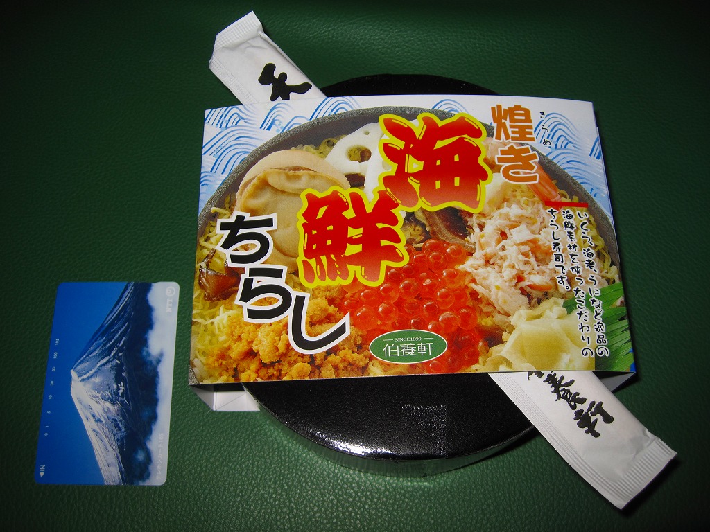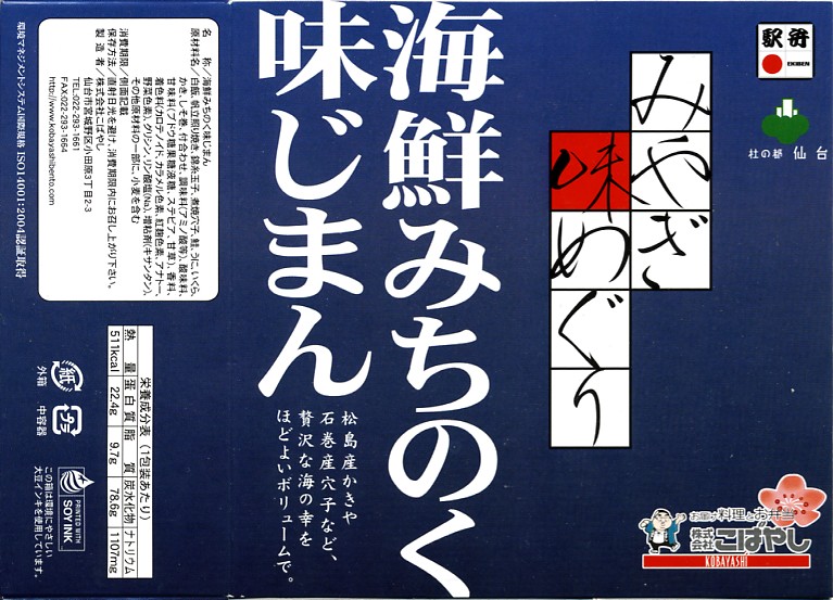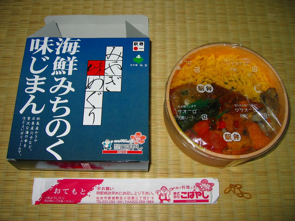 見栄えや内容に対して大仰な名前を名乗る印象で、「海鮮」では御飯の1/3も覆えない少量駅弁。この少量こそがこの駅弁の特徴であり、味は確かな仙台駅弁で、値段もお手頃なので、そういうニーズで駅弁売店にて選択されている。2011年頃までの販売か。