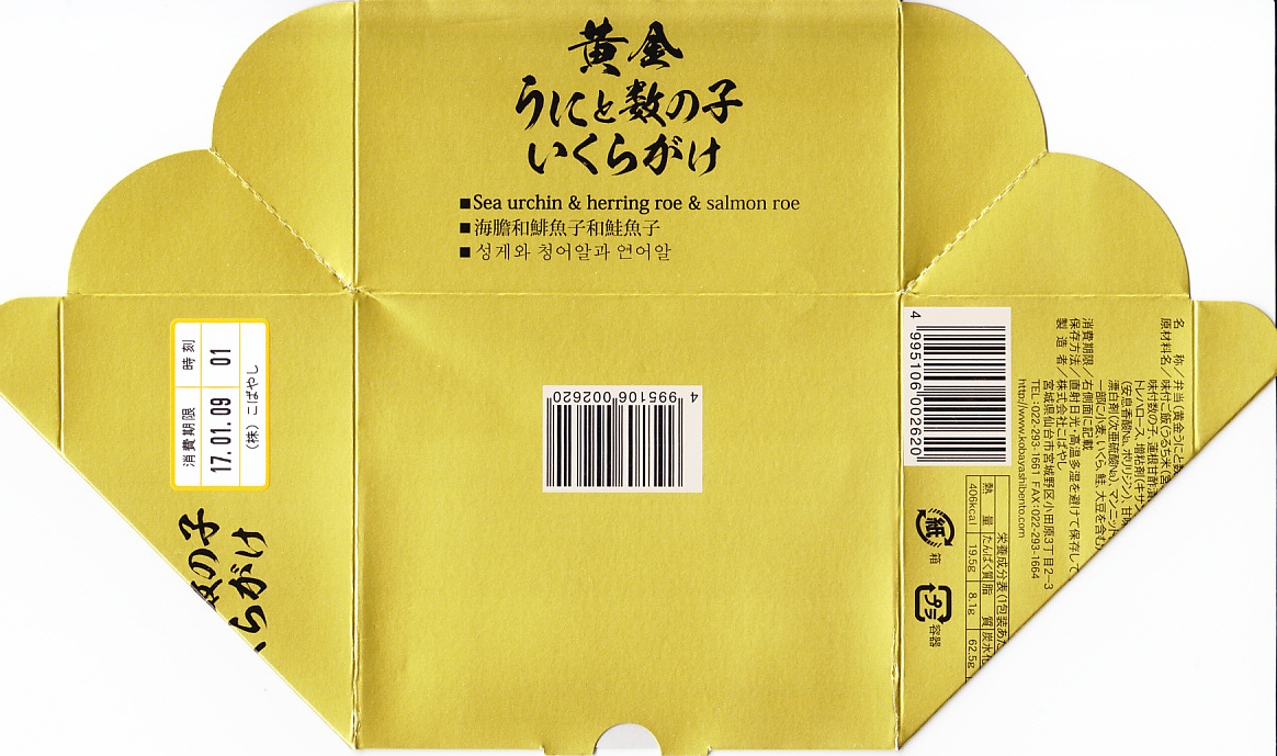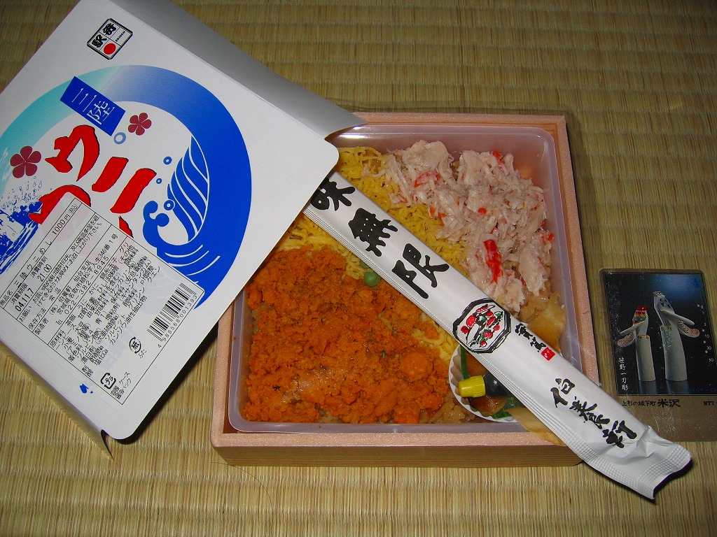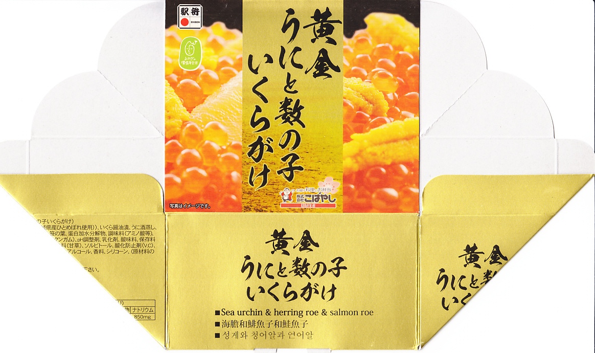 2016(平成28)年12月の発売か。金色と中身の美しい写真がまぶしいボール紙箱に収めた容器に、茶飯を敷き、駅弁の名前のとおりウニとイクラとカズノコで覆う、シンプルな内容。光り輝く内外の見栄えに負けない、良好な味。2020年までの販売か。