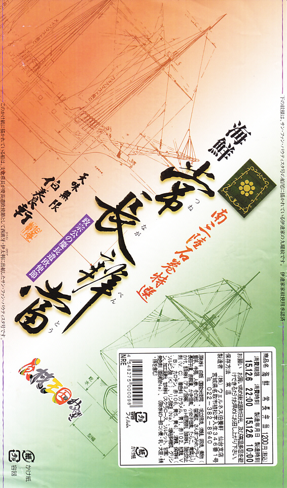 1970年代の、8月28日6時の調製と思われる、昔の仙台駅弁の掛紙。背景は松島にちがいない。当時の駅弁一覧に出てこない名前なので、売られた期間が短かかったのかもしれない。
