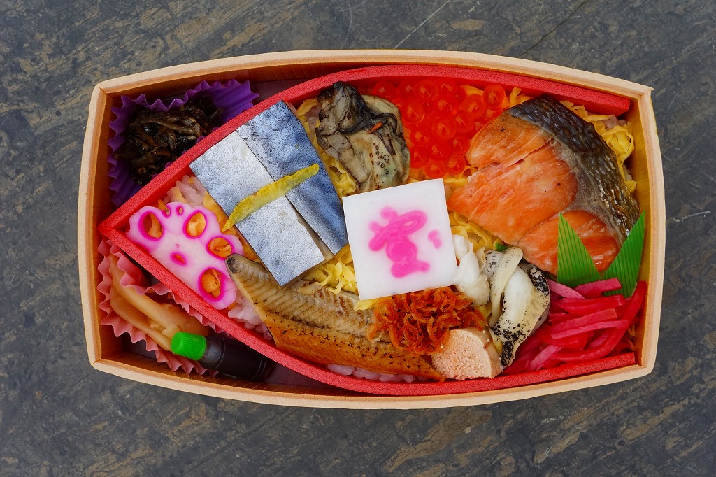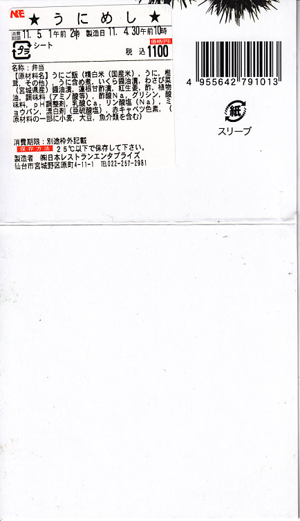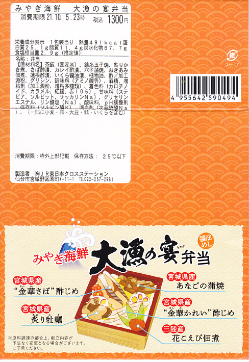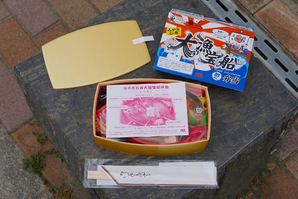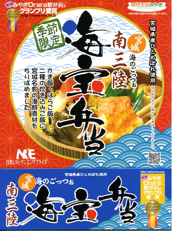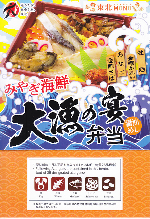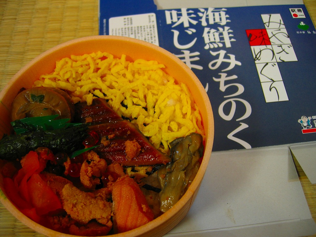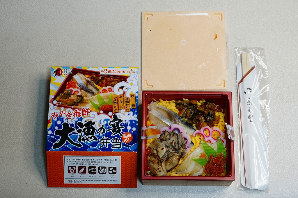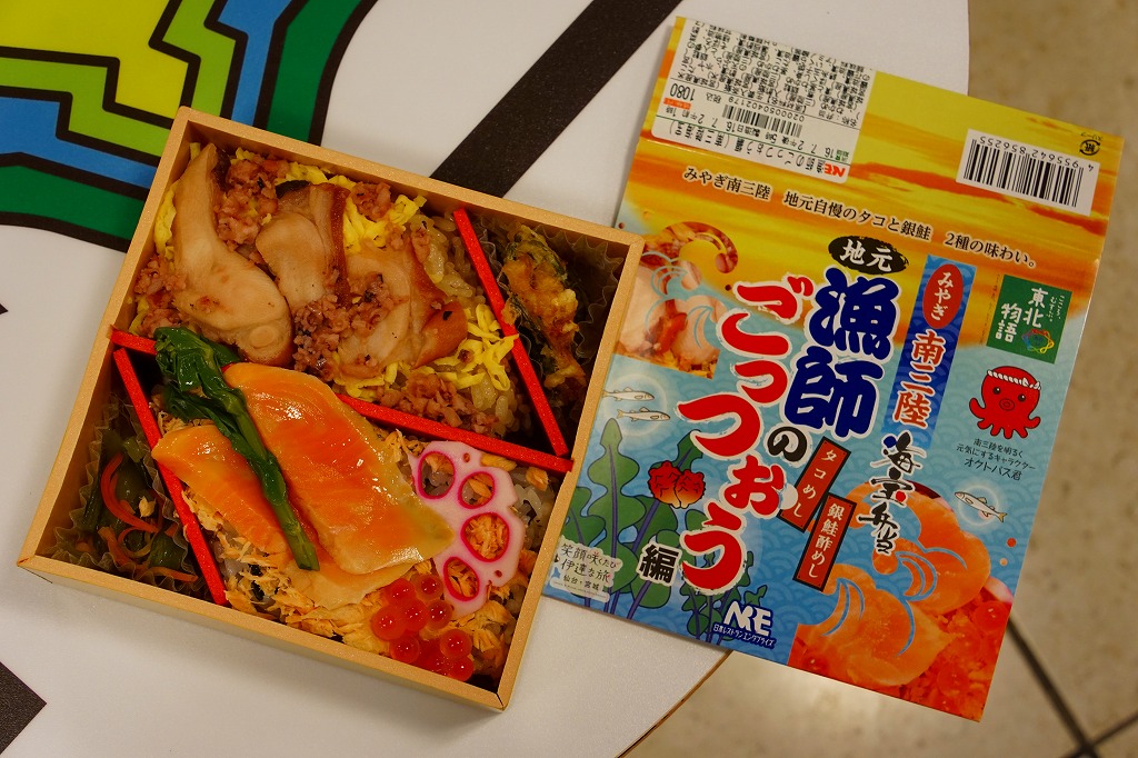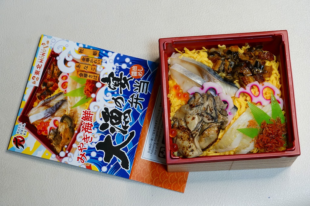 小柄で四角い容器に醤油飯を詰めて錦糸卵で覆い、金華さば酢じめ、あなごの蒲焼、炙り牡蠣、金華かれい酢じめ、花こえび佃煮などを並べる。派手なスリーブや東京での販売という印象に違い、中身は酢飯でなく海鮮でもなく、宮城の食材を満載し、食べて味わって満足できる機能的な内容と分量。地味と滋味が備わると思う。調製元のJR東日本クロスステーションは、かつての日本レストランエンタプライズ(NRE)や日本食堂の仙台支店。仙台駅では売られたかどうか。