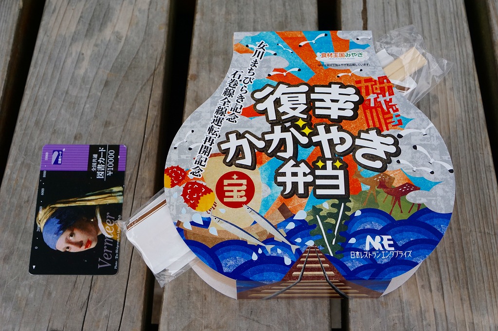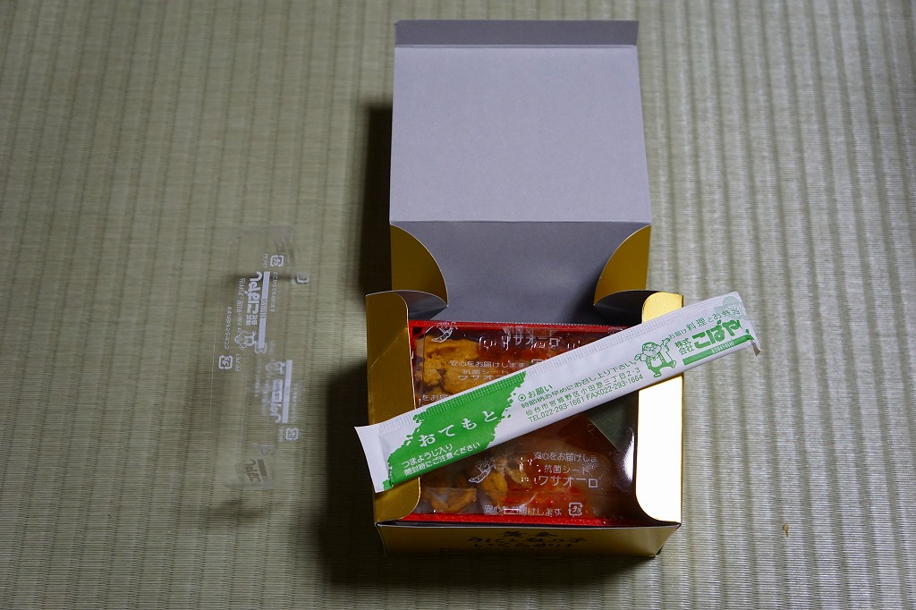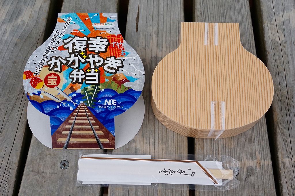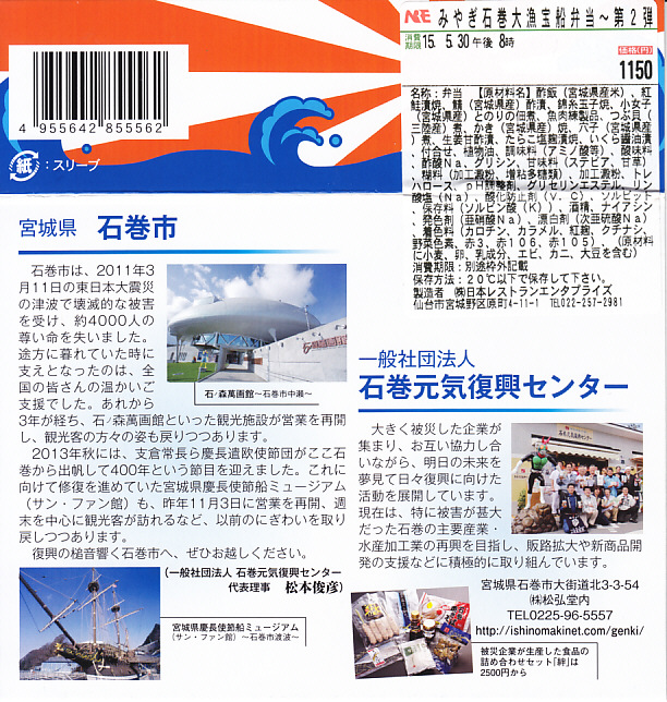 仙台駅の駅弁であるが、テーマは石巻。パッケージの底面で石巻と震災被害と復興への取組を紹介し、おしながきの裏面で駅弁の材料を提供した石巻市内の加工会社6社の名称を紹介する。この駅弁を買った場所も、石巻駅の中のコンビニ。ここまでするのならば、例えばこのコンビニに土休日のみ一日3個でもこれを置いて、石巻駅の駅弁を名乗ってしまえば、より注目と売り上げを得られるのではと思った。