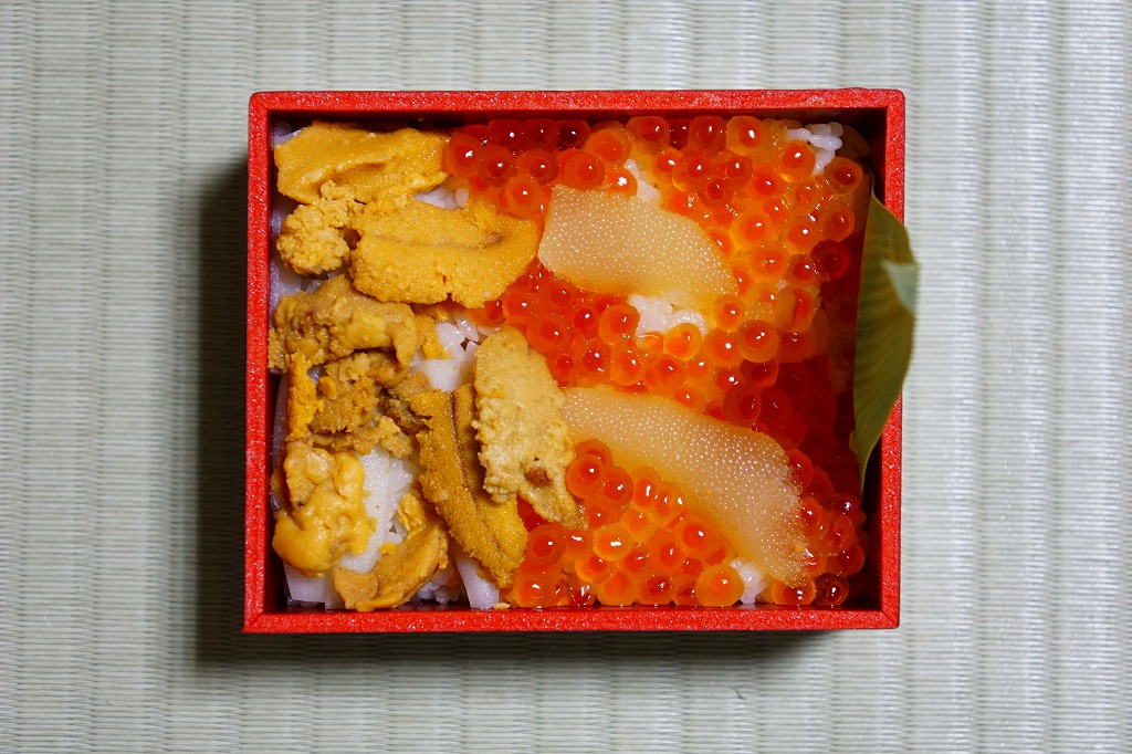 2010(平成22)年に発売か。小柄で深めな容器に透明なふたをして、商品名を書いた窓付きのボール紙の枠にはめる。中身はウニ飯を蒸しウニとイクラ醤油漬とわさび菜で覆うもの。北海道の駅弁や疑義駅弁と何ら変わらない中身で属地性を感じないが、中身の詰め方にギッシリ感があり、食べて楽しくなる感じではある。価格は2011年の購入時で1,100円、2016年時点で1,150円。2019年までの販売か。