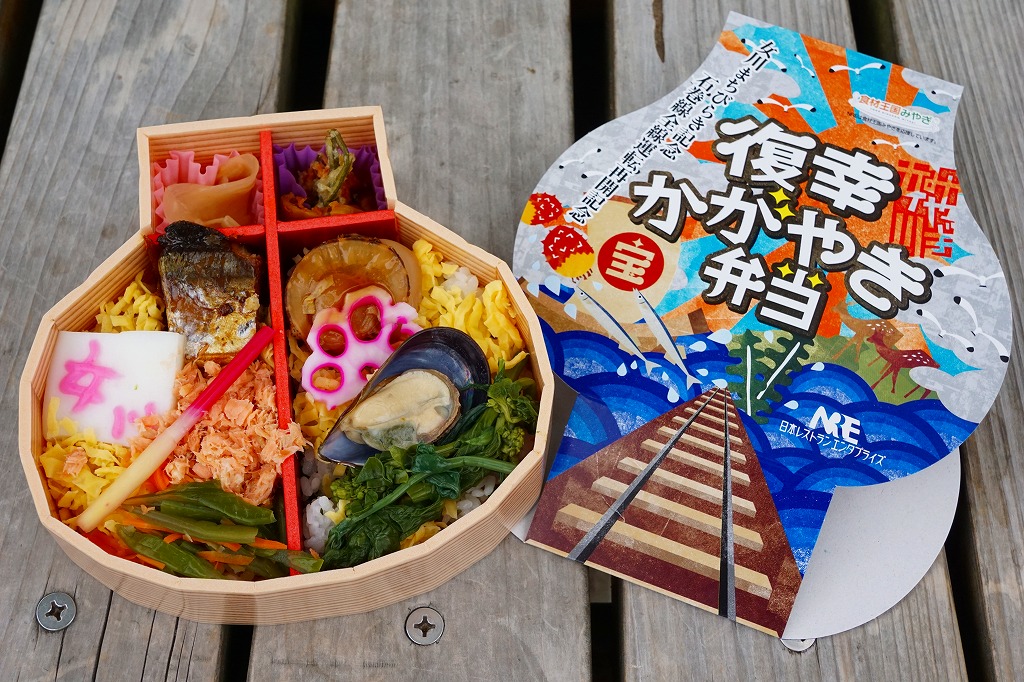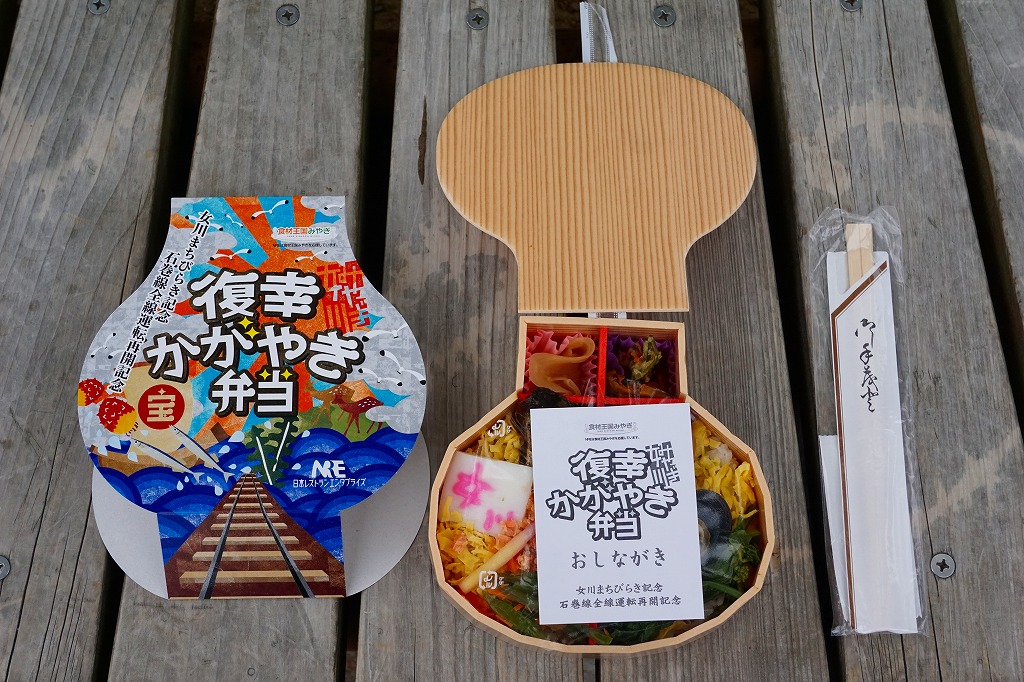 2015(平成27)年3月21日の女川まちびらき及びJR石巻線の全線運転再開を記念して、その同日に発売。震災の影響を受けた4年前の「赤皿貝炊き込み飯」と同じ形のホタテ型容器に、ワカメ御飯と生姜茶飯を詰め、菜の花や鮭フレークや錦糸卵を添え、女川のホヤ、サンマ、ホタテ、ムール貝、かまぼこを使う。添付のおしながきには女川の納入業者5社の名称が並ぶ。小粒な女川の具に滋味があった。約半年間の販売か。