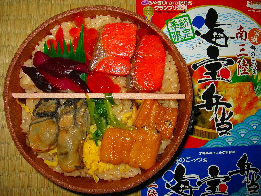 宮城県とJRの駅弁レシピ公募「第1回みやぎOrara駅弁コンテスト」でグランプリを獲得した作品の商品化で、2006(平成18)年12月1日に発売。木桶を模した円形の容器を、中身の写真を取り入れたデザインなボール紙の枠にはめる。中身は茶飯の上に1/4ずつ、サケ、イクラ、カキ、アナゴを載せるもの。