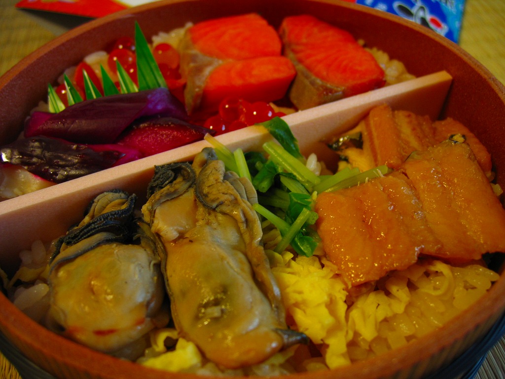 秋冬の駅弁大会シーズンに向けた、2009(平成21)年秋の新商品か。底の浅い円形の容器に透明なふたをして、駅弁の名前その他文字が主体のボール紙の箱に詰める。中身は白御飯の上に刻み海苔を少々散らし、錦糸卵、カキ1個、煮焼アナゴ1切れ、ホタテ照焼1個、ウニとイクラを少々、味噌のしそ巻1本と鮭を1片載せるもの。
