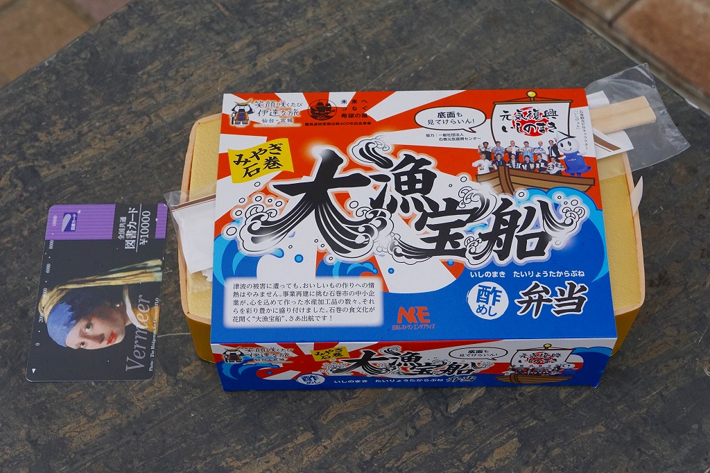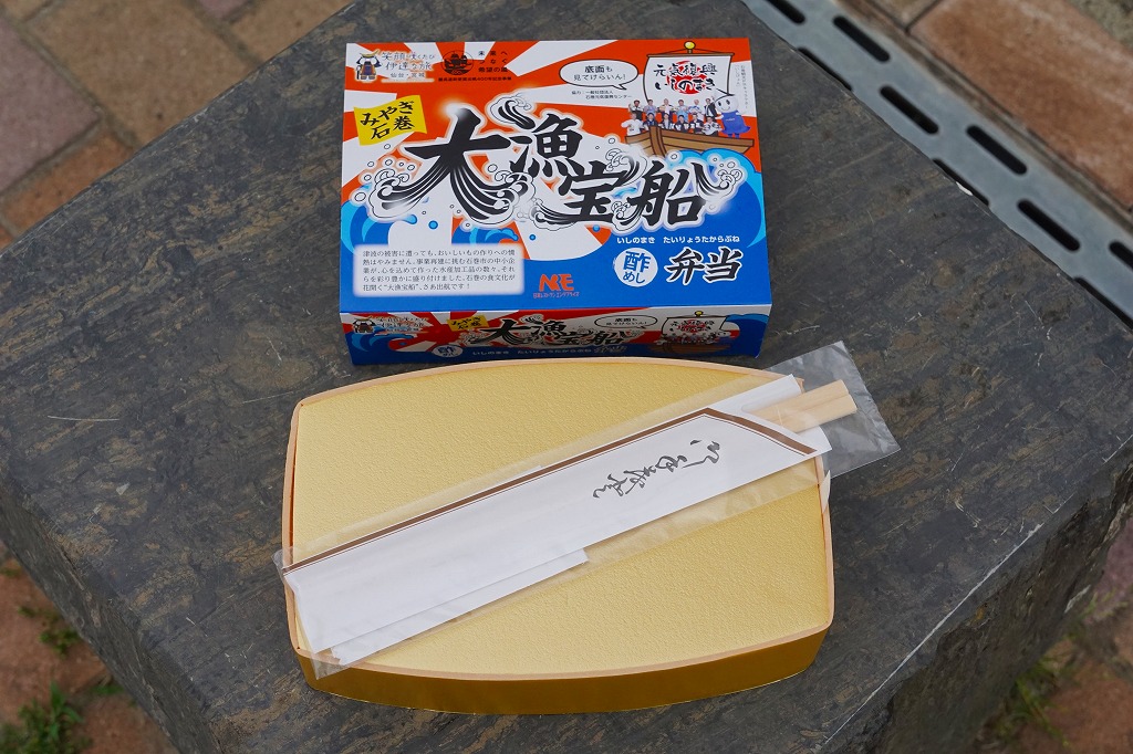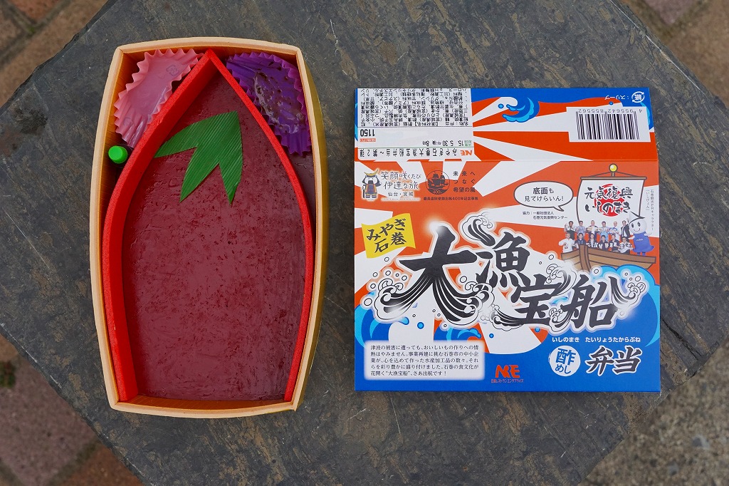 樽型にもイカ型にも見える容器を、賑やかな絵柄と石巻の説明を書いたボール紙の枠にはめる。中身は酢飯を鮭とタラコの漬け焼き、三陸産のつぶ貝煮とイクラ醤油漬と花小えび、宮城県産の小女子とノリの佃煮と炙りかき、石巻産のアナゴ焼きと金華サバ酢締めなどで覆う、ちらしずし。大量ではない分量で、見て食べて感じておいしくなっている。2017年までの販売。
