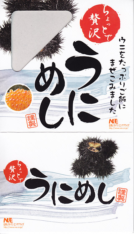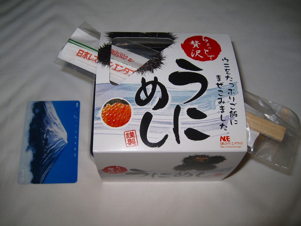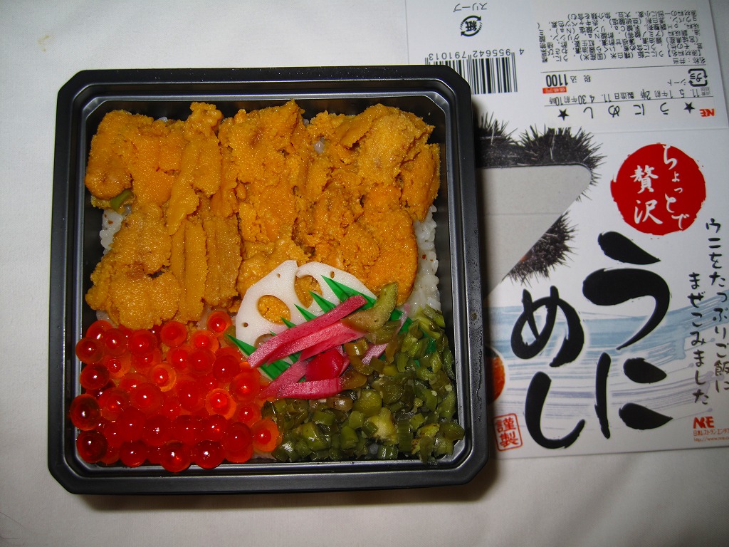 2009(平成21)年に発売か。真っ黒な円形の容器をセロハンテープで固定し、中身の写真を印刷したボール紙の枠にはめる。中身は酢飯の上をホタテ、蒸しウニ、カニ風味フレーク、エビ、イクラ、ウナギ蒲焼、錦糸卵、シイタケ煮、酢れんこん、生姜甘酢で覆う、ウニがメインのちらしずし。具がボロボロこぼれて食べにくいものの、様々な味が口の中に広がる。価格は2010年の購入時で1,000円、2016年時点で1,100円。2018年頃までの販売か。