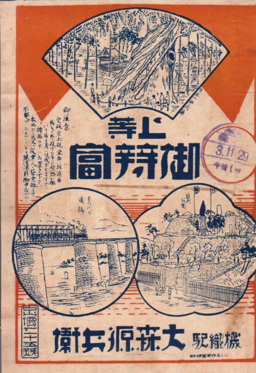 1928(昭和3)年11月29日の調製と思われる、昔の機織駅弁の掛紙。機織駅とは、1901(明治34)年11月1日に「能代」の駅名で開業し、1909(明治42)年11月1日に「機織」に改称し、さらに1943(昭和18)年6月15日に改称した、現在の東能代駅。長らく駅弁販売駅でなくなっていたが、2005年頃に大館駅弁の販売が開始され、時刻表上でも駅弁販売駅に返り咲いた。