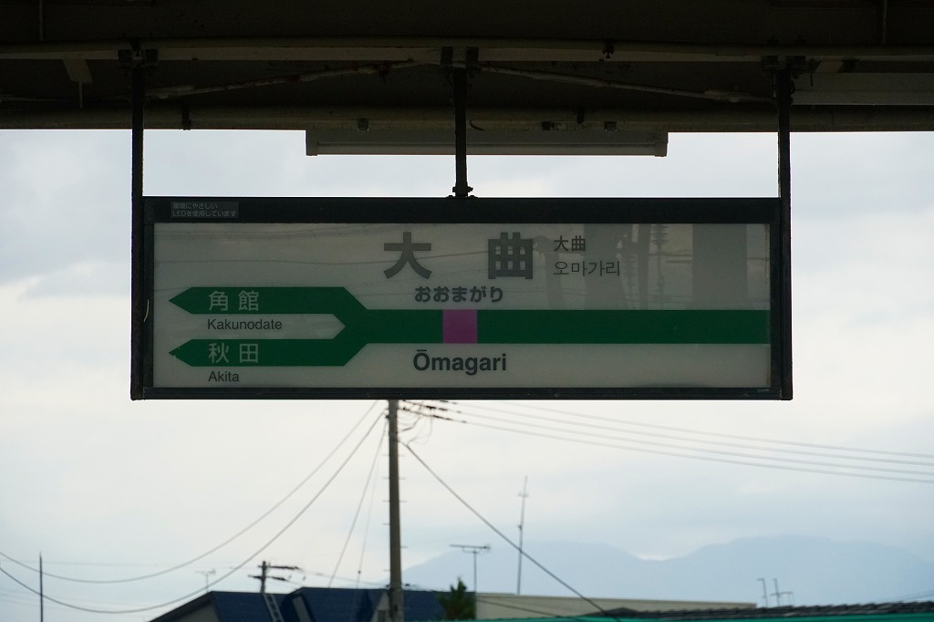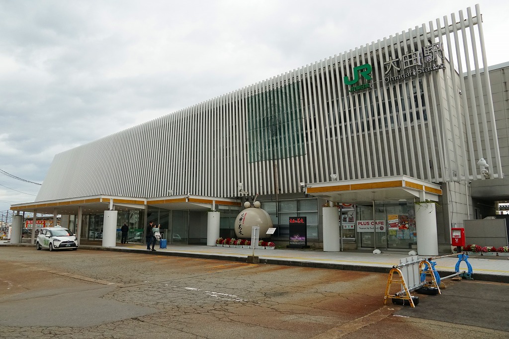 秋田駅から秋田新幹線こまち号で30分。大仙(だいせん)市は2005年に8市町村が合併してできた、人口約8万人の広く大きな市。大曲駅は奥羽本線が生保内(おぼない)線のち田沢湖線を分けた駅で、1997年3月開業の秋田新幹線が進行方向を変える駅。1924(大正13)年から駅弁を販売した睦月館が1995(平成7)年に撤退、その後はこの駅のみの駅弁はないが、秋田駅弁や大館駅弁の一部がキオスクで売られる。1904(明治37)年12月21日開業、秋田県大仙市大曲通町。