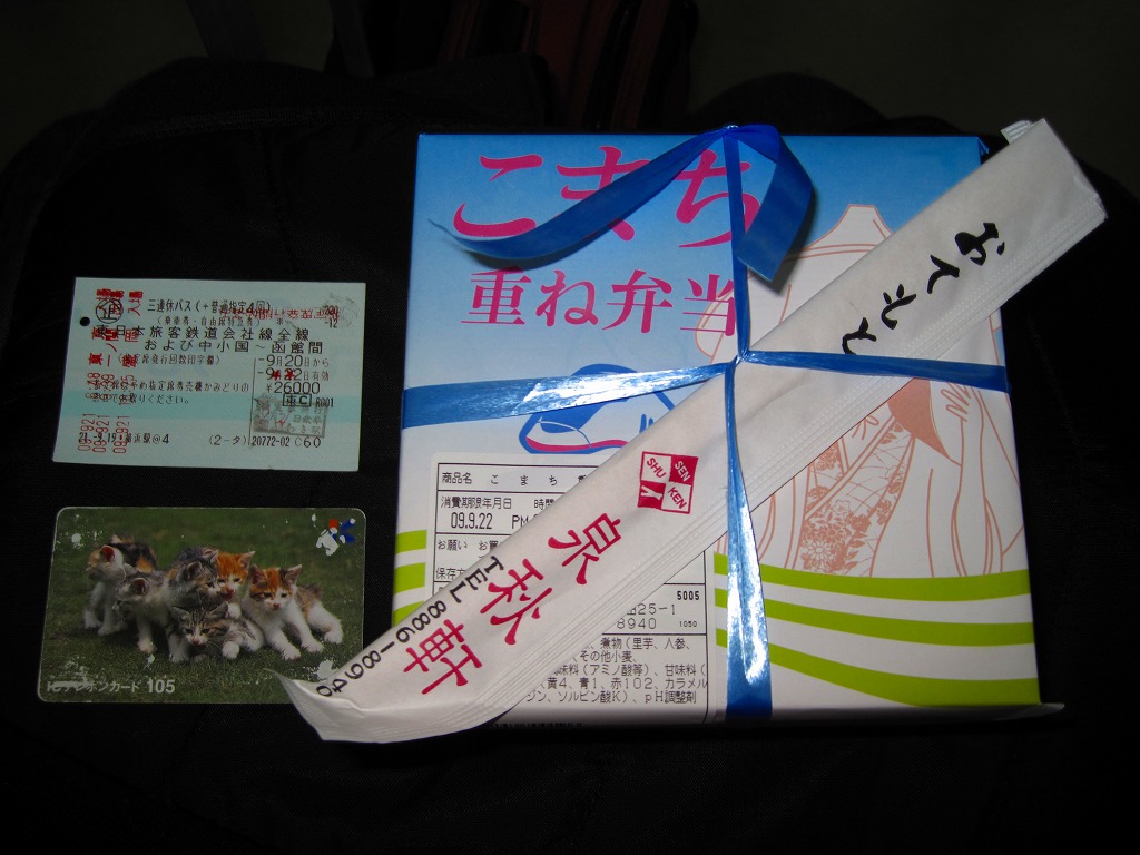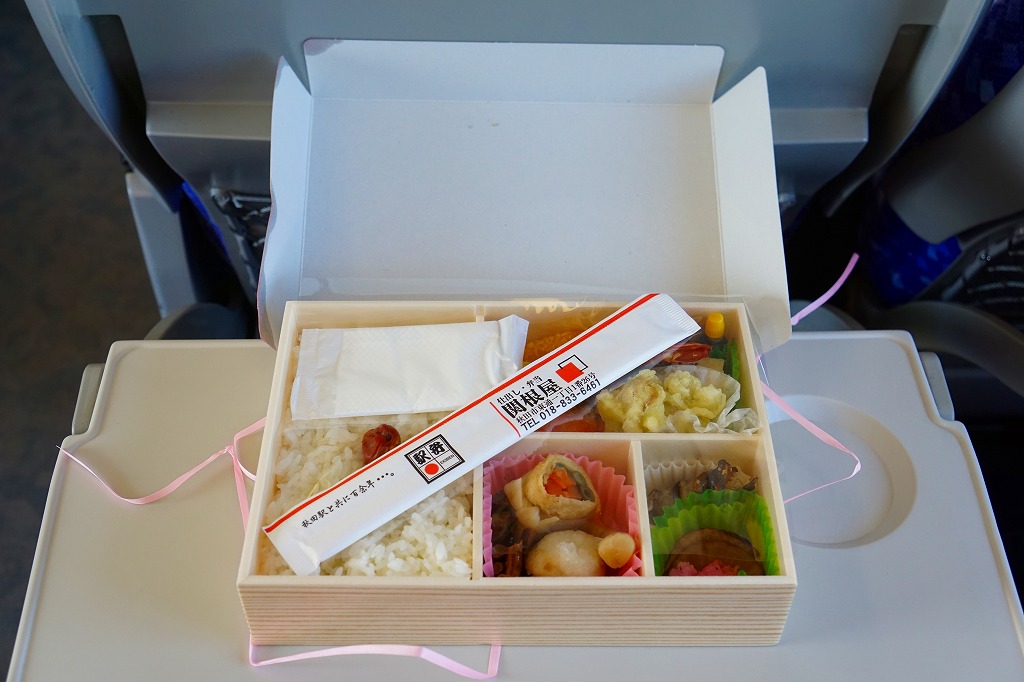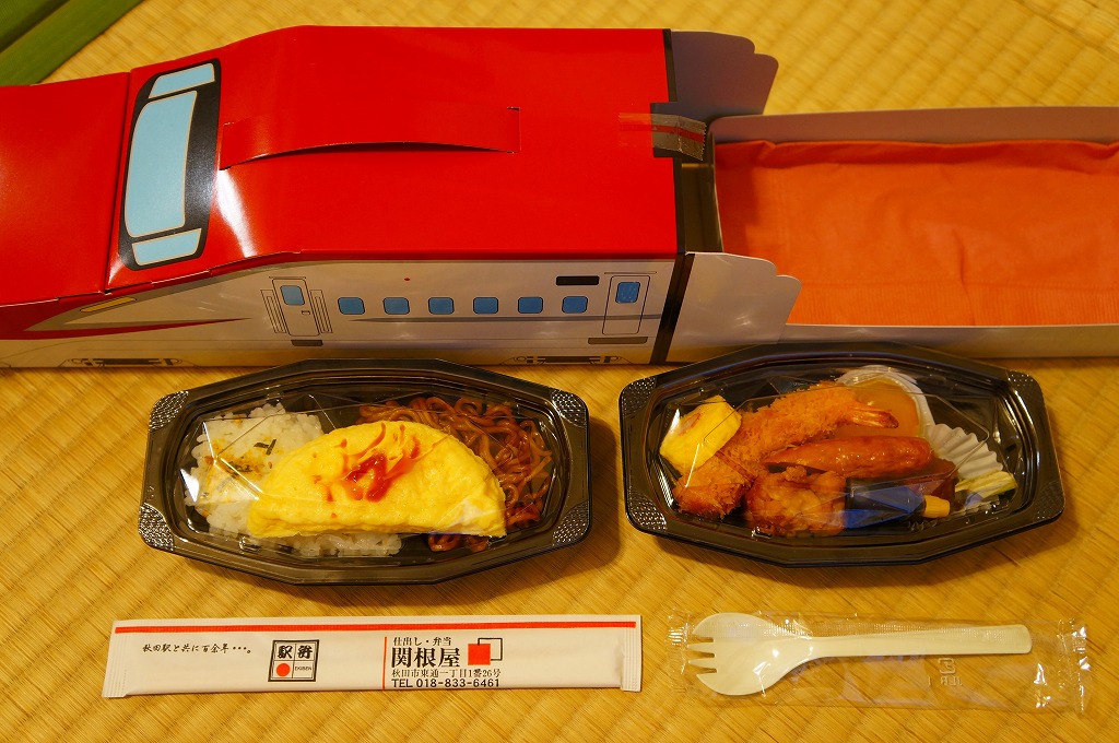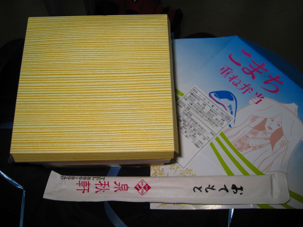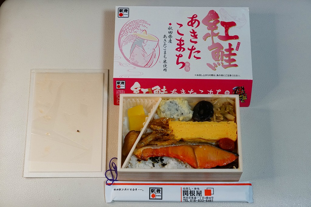 秋田に伯養軒の支店があった頃から存在した駅弁で、外見も内容もそっくりそのまま泉秋軒へ引き継がれた模様。柔らかい正方形の容器を二段重ねて、木目柄のボール紙でふたをして、秋田新幹線と女性を描いた掛紙で包み、ビニールひもで十字にしばる。中身は下段が日の丸御飯、上段がおかずで舞茸天、帆立煮、メダイ焼、玉子焼、サトイモやニンジンなどの煮物、フナ甘露煮など。秋田らしさはぼやっと見ただけでは分からないけれど、おいしい幕の内駅弁。