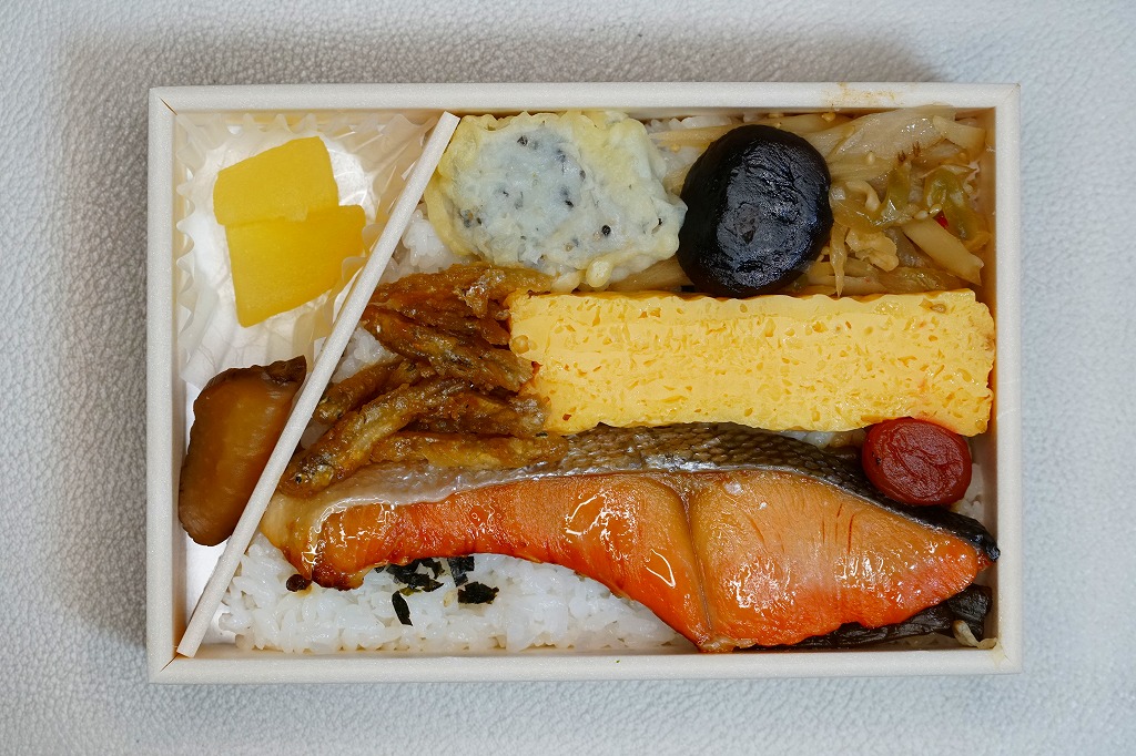 2023(令和5)年10月1日に秋田駅や東京駅などで発売、同日からのJR東日本の駅弁キャンペーン「駅弁味の陣2023」にエントリー。やや小柄な長方形のプラ容器に、秋田県産米あきたこまちの白飯を詰め、紅鮭の塩麹漬け焼き、わかさぎ唐揚、とんぶり入りかまぼこ、玉子焼、生姜ごぼう、きゃらぶき、しいたけで覆い、いぶり大根漬とりんごのコンポートを添える。ボダッコと呼ばれる塩鮭あるいは紅鮭を含め、秋田の素材と料理でできた、並等幕の内駅弁のようなつくりで、上等幕の内駅弁の値段を持つお弁当。11月までの開催期間をもって終売か。
