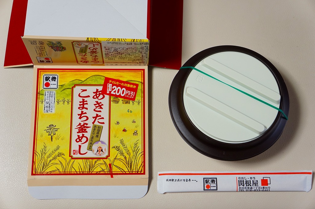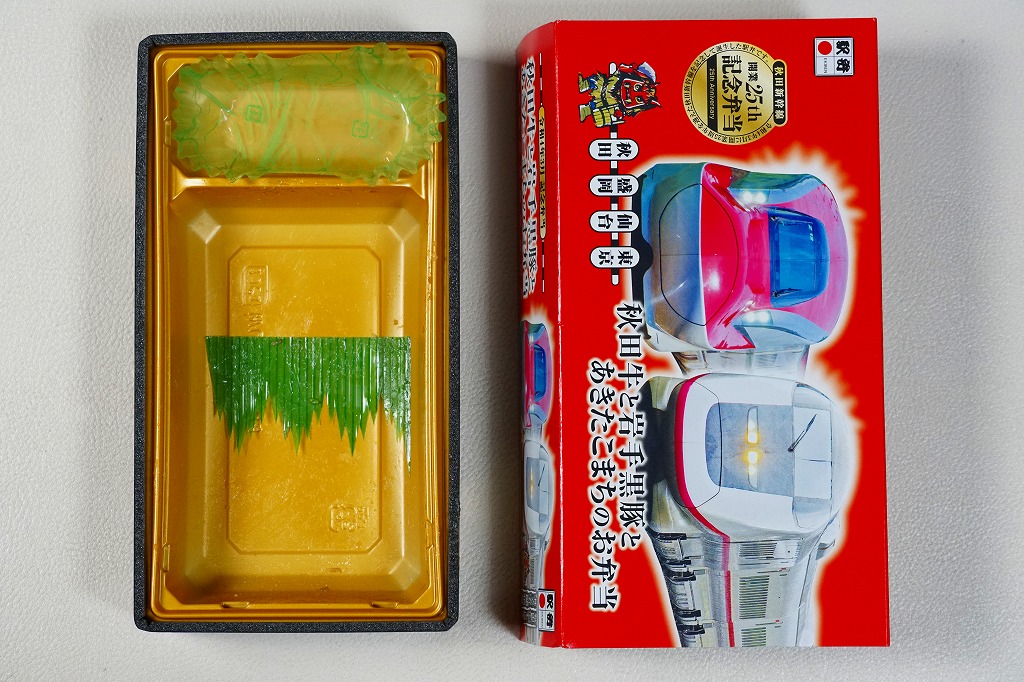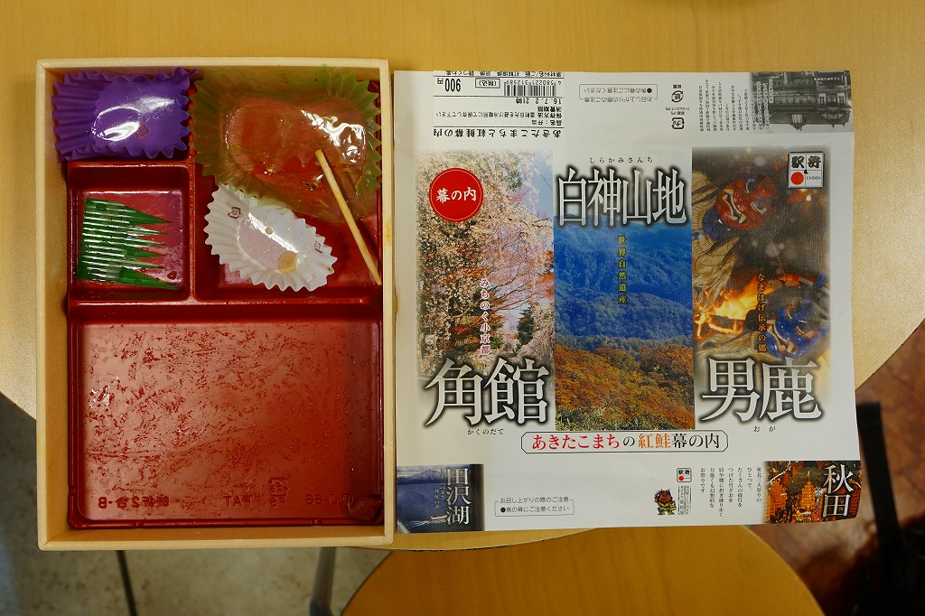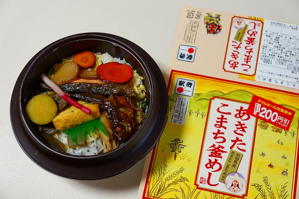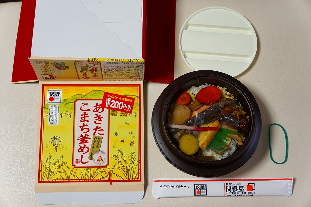 中身の見た目が雑然として、他の秋田駅弁に比べて味が引き立っていないのが惜しいが、秋田が分かりやすい内容である。写真のとおり、新宿駅のNREの駅弁売店は、夕刻になると売れ残りの駅弁を200円引きで販売する。これは駅の駅弁売店では、とても珍しい。2018年までの販売か。