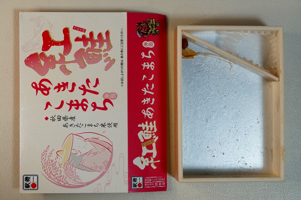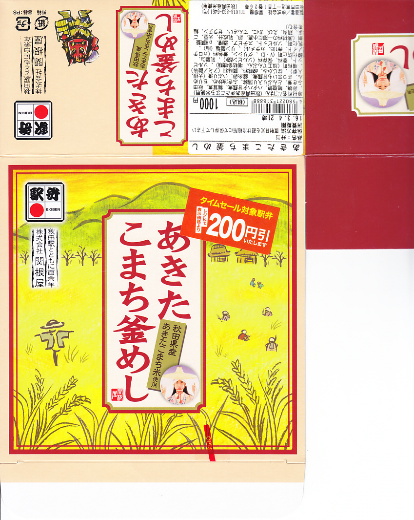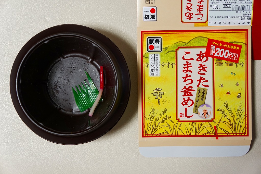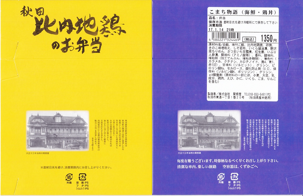 中身の見た目が雑然として、他の秋田駅弁に比べて味が引き立っていないのが惜しいが、秋田が分かりやすい内容である。写真のとおり、新宿駅のNREの駅弁売店は、夕刻になると売れ残りの駅弁を200円引きで販売する。これは駅の駅弁売店では、とても珍しい。2018年までの販売か。