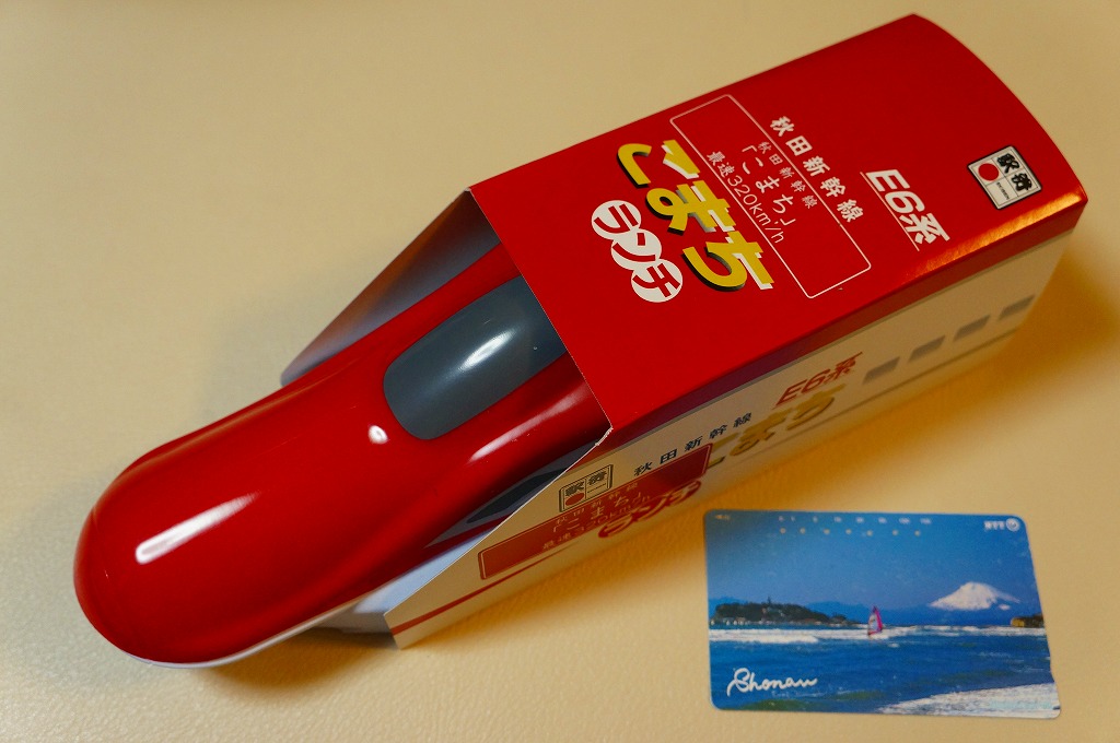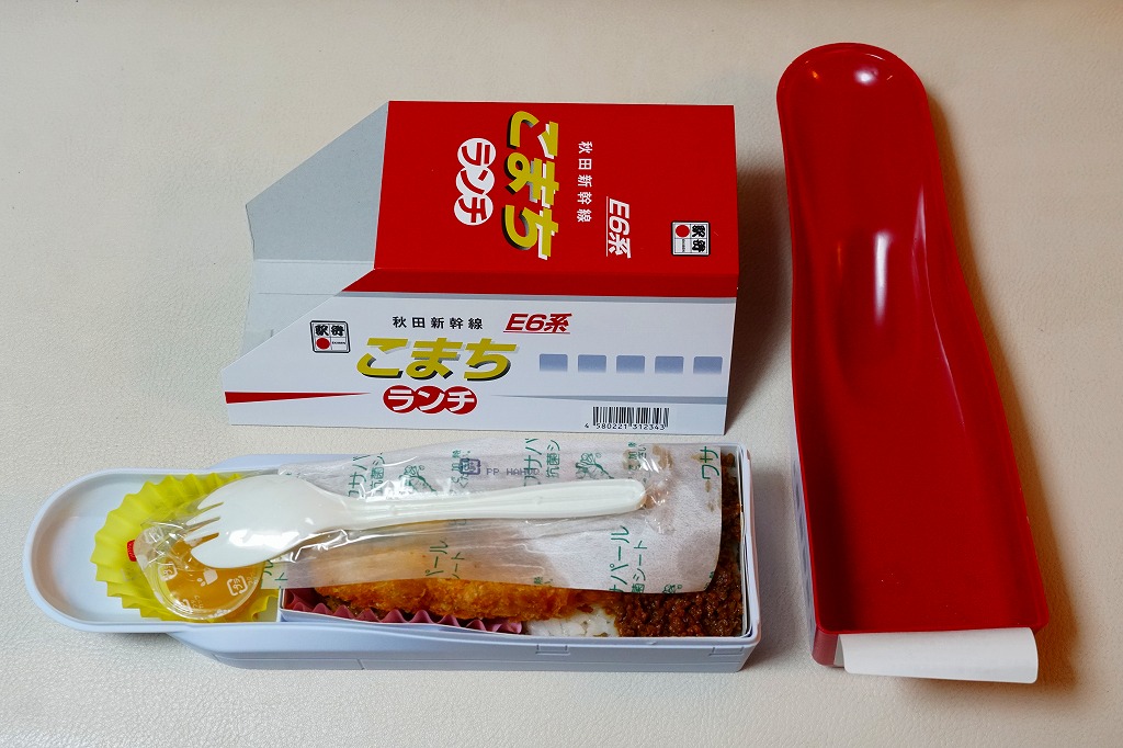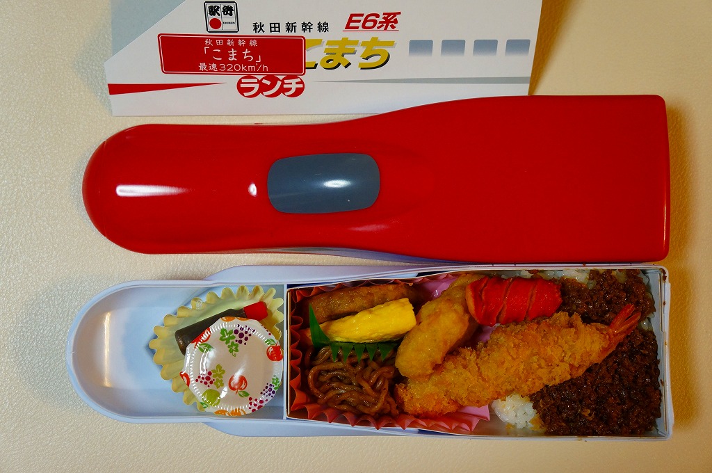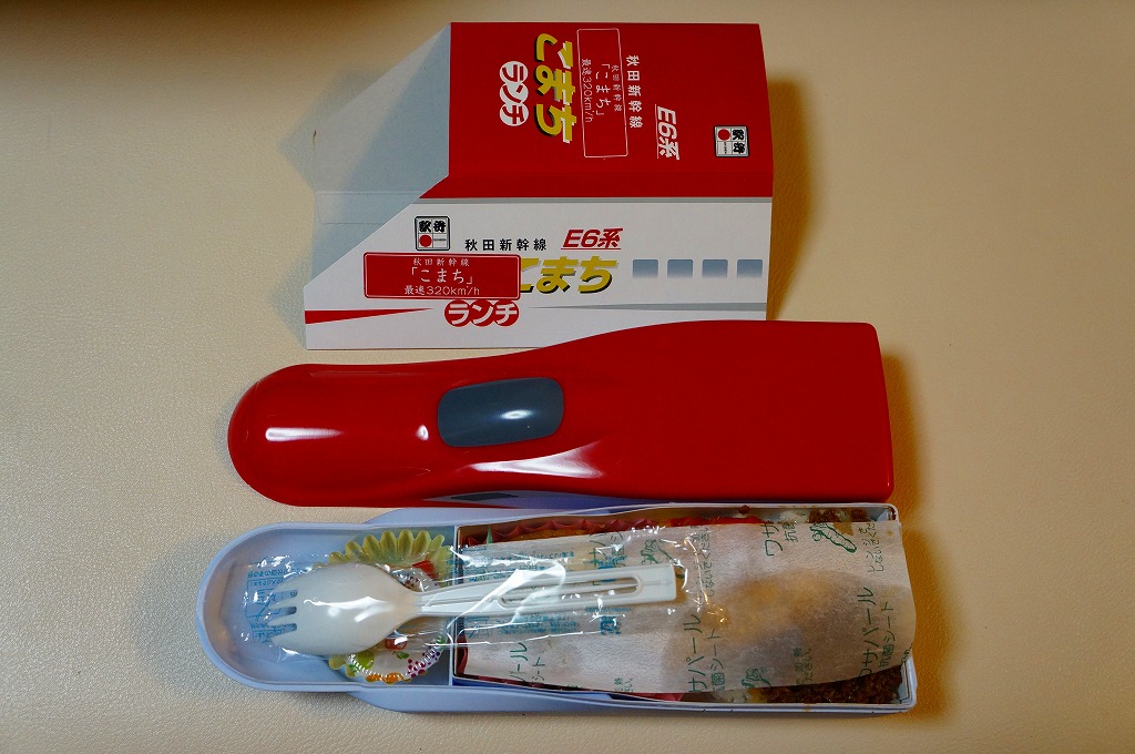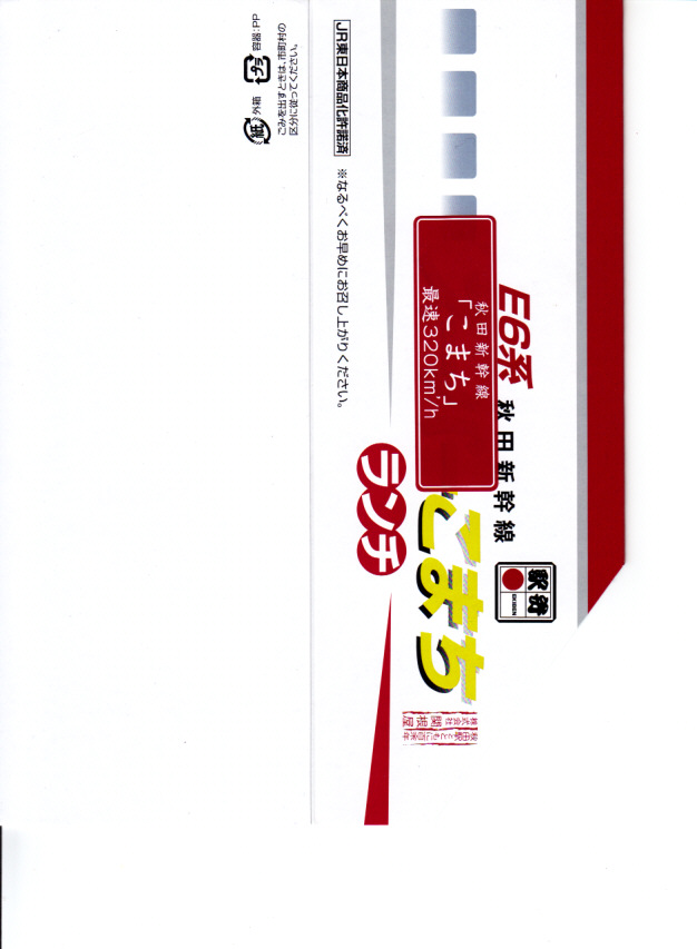 上記の駅弁「E6系こまちランチ」の、2013年の発売当時の姿。容器も中身も価格も同じで、名前だけが違う。2013(平成25)年3月から1年間だけ、秋田新幹線の列車名は、E3系電車を使う「こまち」と、E6系電車を使う「スーパーこまち」の2種類があった。E3系の引退とE6系への統一により、「こまち」の1種類に戻った。