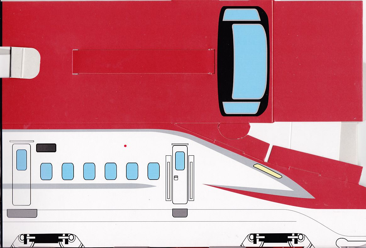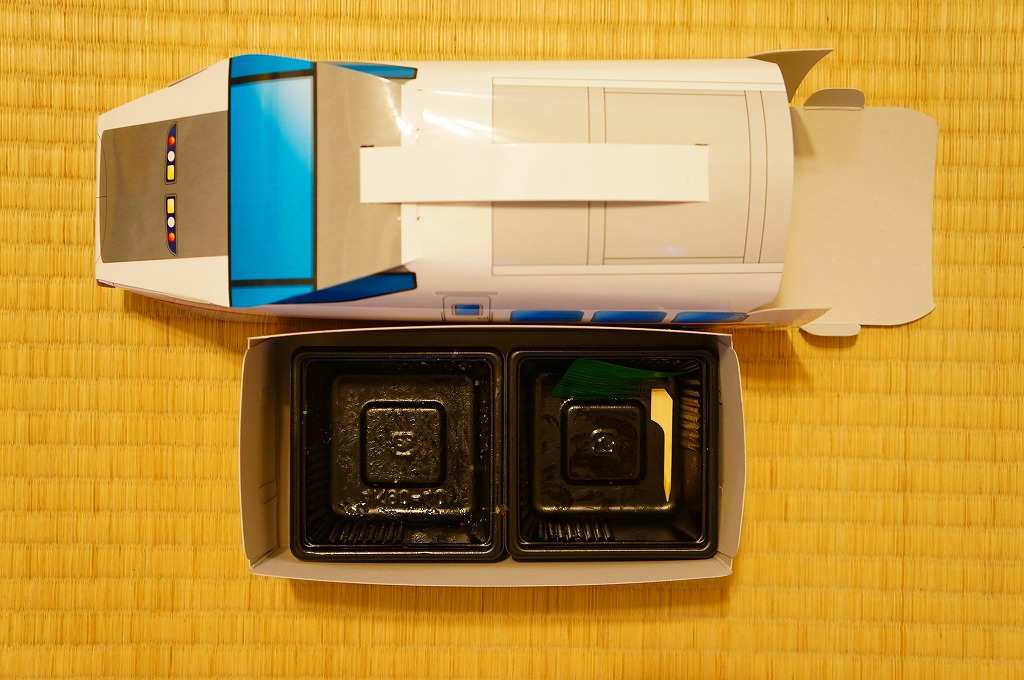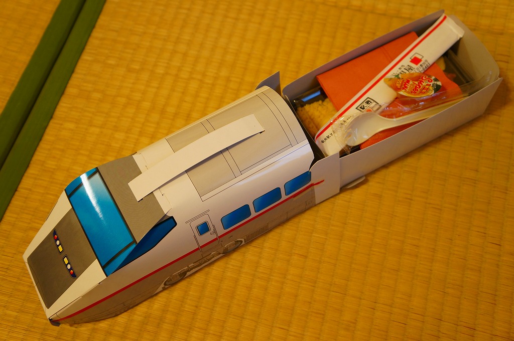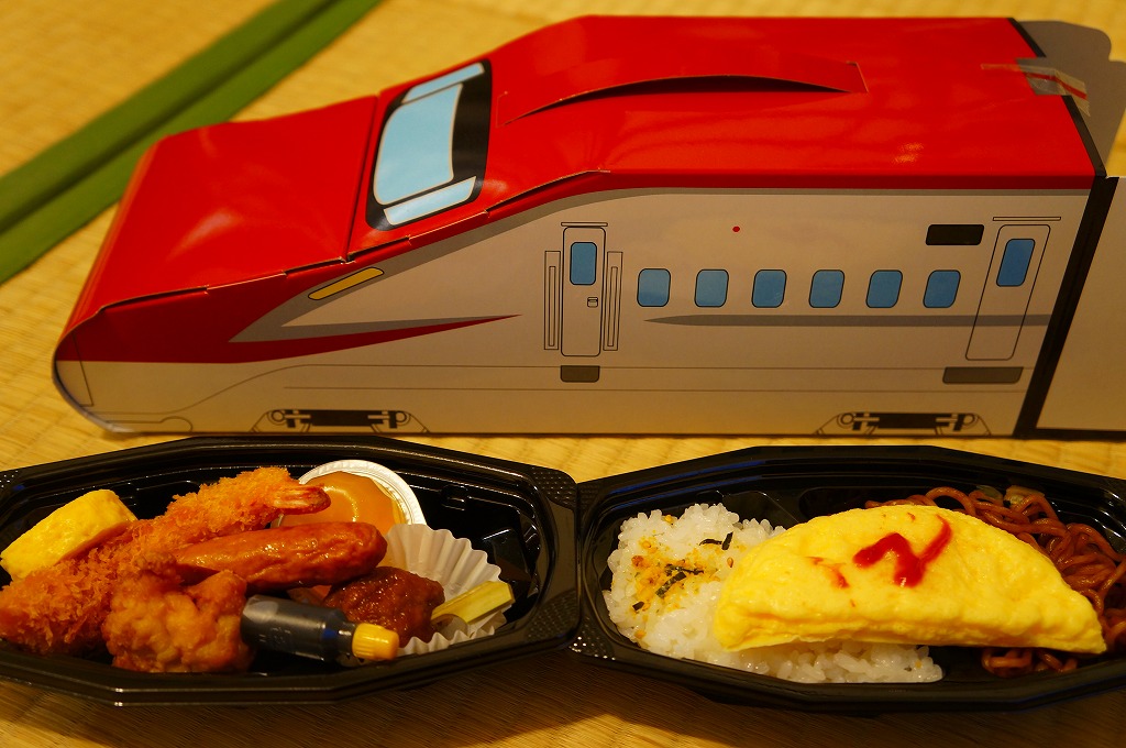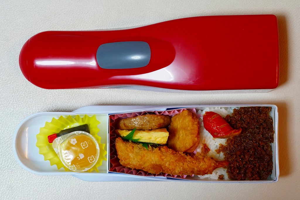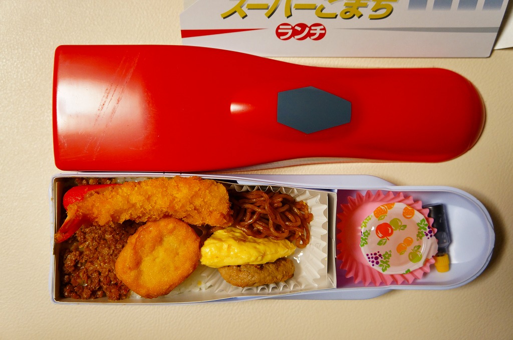 中身は白御飯を、エビフライ、ウインナー、チキンナゲット、ハンバーグ、オムレツ、やきそば、とりそぼろで覆うもの。これもまた、過去の東の新幹線の先頭車を容器にした駅弁と同じく、中身だけを取り上げればチープでうまくないお子様ランチ。容器を買う駅弁である。