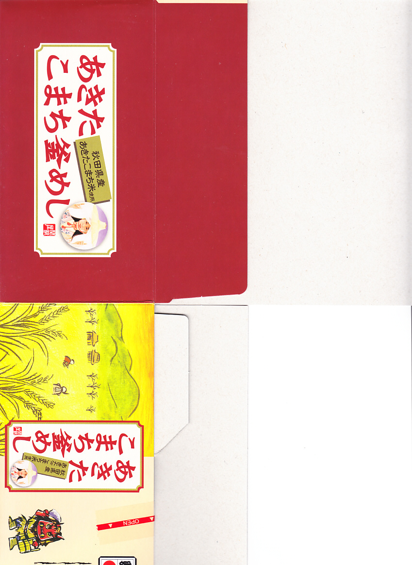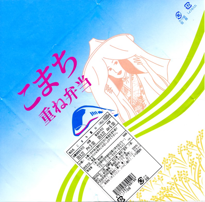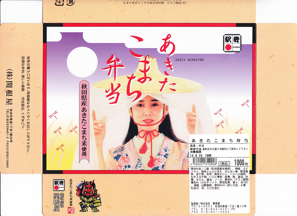 1988(昭和63)年8月1日に「わっぱ舞茸」とともに秋田駅で発売。ボール紙のふたの写真は、1984(昭和59)年から2000年頃まで市販の秋田米「あきたこまち」の米袋に使われた市女笠(いちめがさ)の秋田美人「こまち娘」。中身は駅弁の名前のとおり、秋田県産あきたこまちを使う日の丸御飯に、焼鮭、エビフライ、マイタケ天、焼売、玉子焼、サトイモやぜんまいなどの煮物、ハタハタ唐揚、いぶりがっこなどのおかず。普段使いで秋田の色を出した、古めかしい幕の内駅弁。価格は2010年時点で900円、2014年の購入時で1,000円、2022年3月から1,100円、2024年時点で1,200円、10月から1,250円。