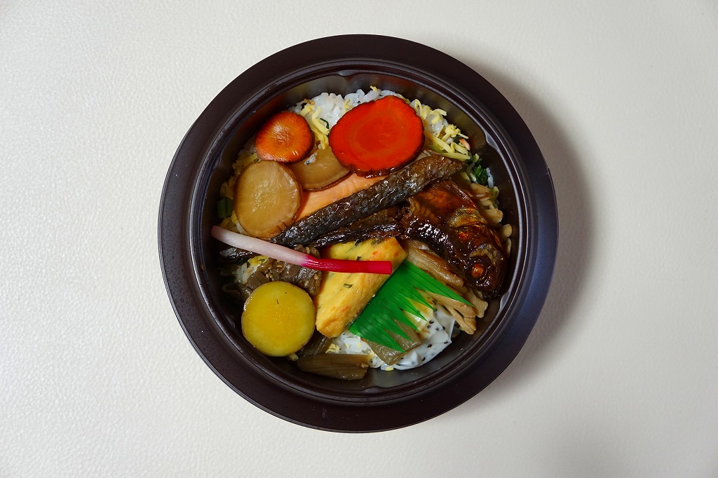 2015(平成27)年3月までに発売か。大きなボール紙製のパッケージに円形の容器を詰めるが、加熱機能付きの駅弁ではない。円形のプラ製な釜飯型容器に、秋田米あきたこまちの白御飯を詰め、ハタハタ甘露煮、鮭塩焼、マイタケ煮、フキ煮、とんぶり入りかまぼこ、サツマイモ甘露煮、いぶり漬物などを散らす。
