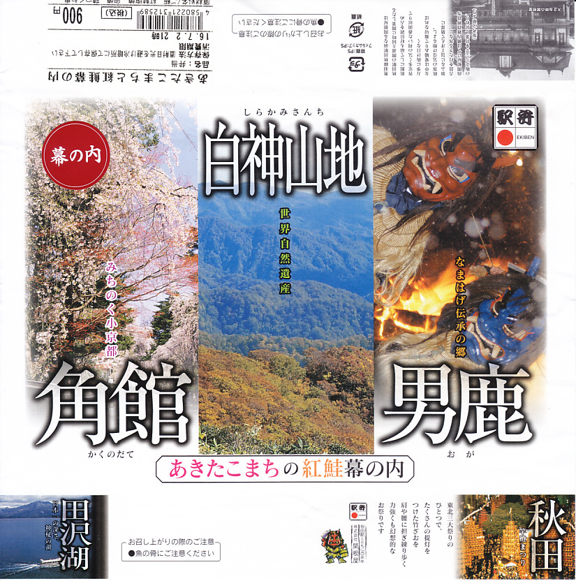 2015(平成27)年の年末に東京駅の駅弁売店「駅弁屋 祭」でデビューか。東京駅以外で売られているのだろうか。掛紙には角館の桜、白神山地、男鹿のなまはげ、田沢湖、秋田の竿灯まつりの写真が使われる。中身は日の丸御飯に焼き鮭を載せ、玉子焼、鶏つくね串、とんぶり入かまぼこ、いぶり人参揚、きんぴらごぼう、いぶりがっこなどを添える。つまり、秋田でしか見ないような食材も入っている幕の内弁当。しかし秋田でなく東京で売られる駅弁という可能性がある。価格は2016年の購入時で900円、2022年時点で980円。2022年までの販売か。