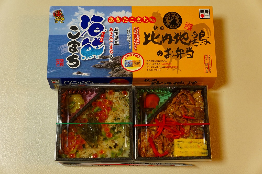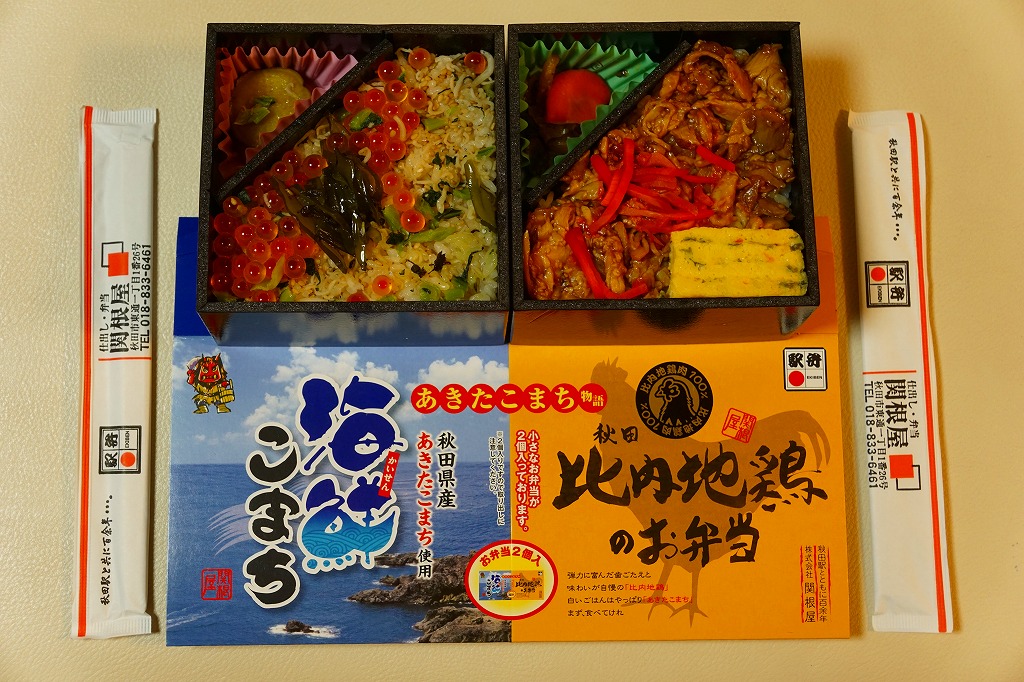 2015(平成27)年の発売か。秋田駅の駅弁というよりはむしろ、東京駅や仙台駅で秋田駅弁として輸送販売される商品。見た目のとおり、「海鮮こまち」を名乗る商品と、既存の秋田駅弁「比内地鶏のお弁当」のセット。白飯をイクラと野沢菜ちりめんとしそワカメで覆い、サツマイモ甘露煮を添える「海鮮こまち」と、茶飯を比内地鶏焼と紅生姜で覆い、玉子焼ときのこ味噌和えといぶり人参漬を添える「比内地鶏のお弁当」が、それぞれ小さな長方形の容器に収まり、2個が同じボール紙枠に詰まる。割り箸を2膳添付。味はそうでもなし。2017年に構成を「あきたこまち重」と「秋田比内地鶏のいいとこどり弁当」のペアに変更のうえ、ほどなく終売か。