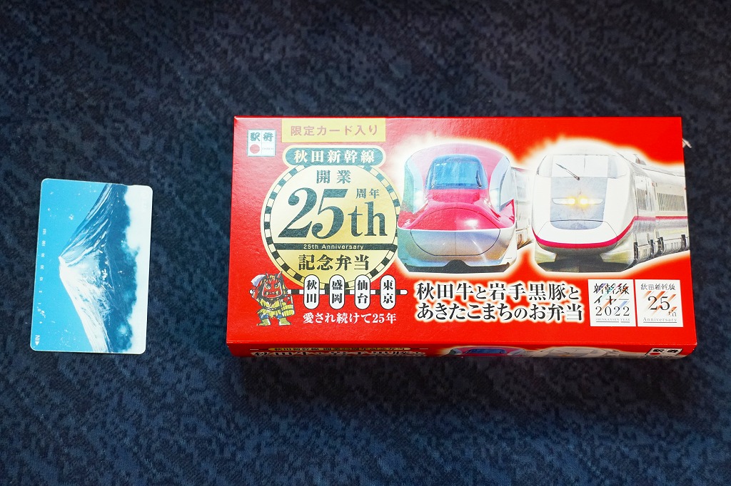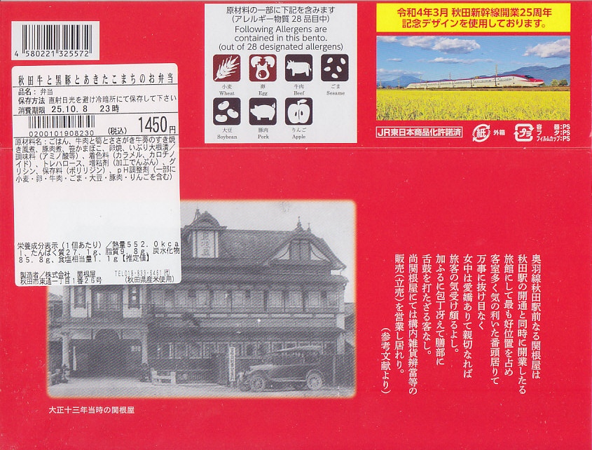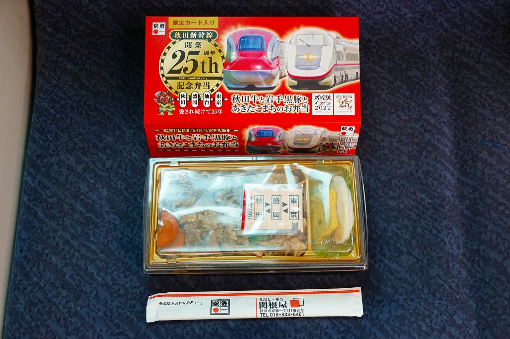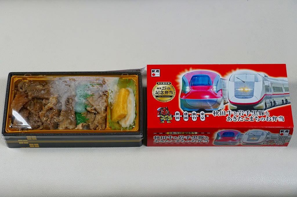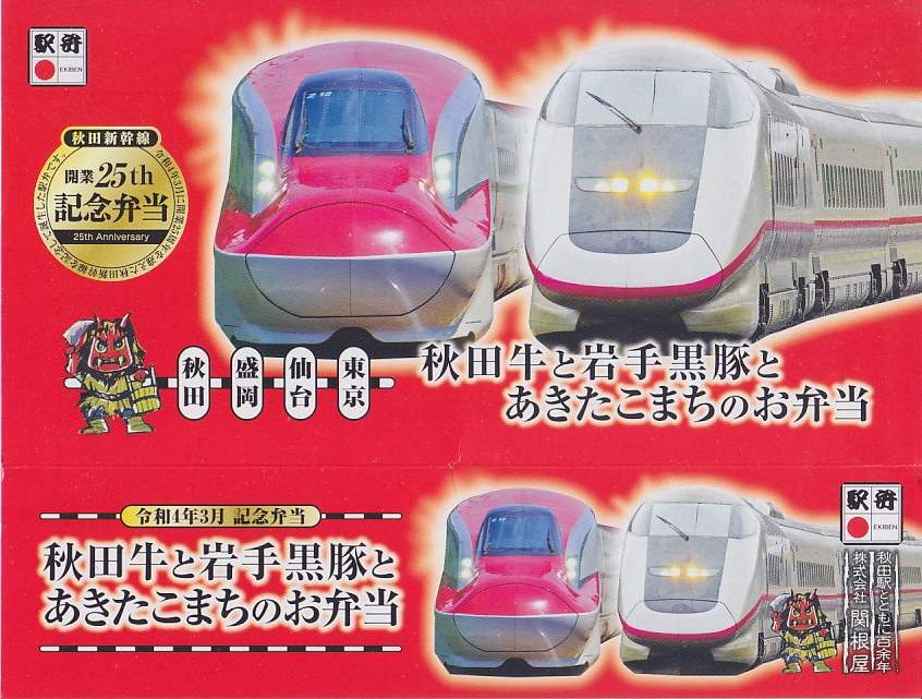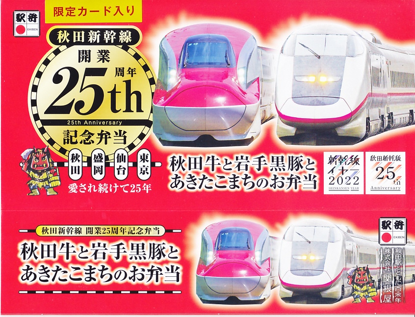 上記の駅弁「秋田牛と岩手黒豚とあきたこまちのお弁当」の、2022(令和4)年の発売時の発売時の姿。容器や中身は、上記の2025年のものとほぼ変わらない。当時のスリーブでは、「秋田新幹線開業25th周年記念弁当」の丸印が大きく、秋田新幹線25thと書かれたロゴマークもあった。中身のうちいぶり大根漬は、いぶり人参漬だった。